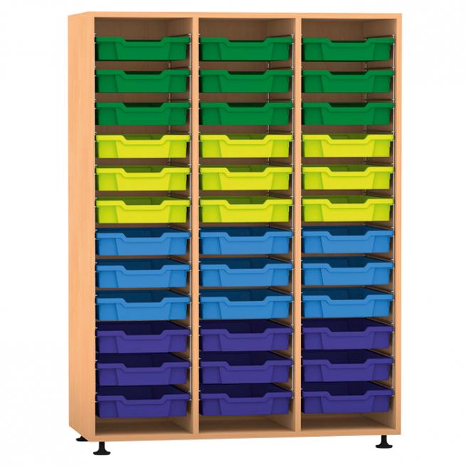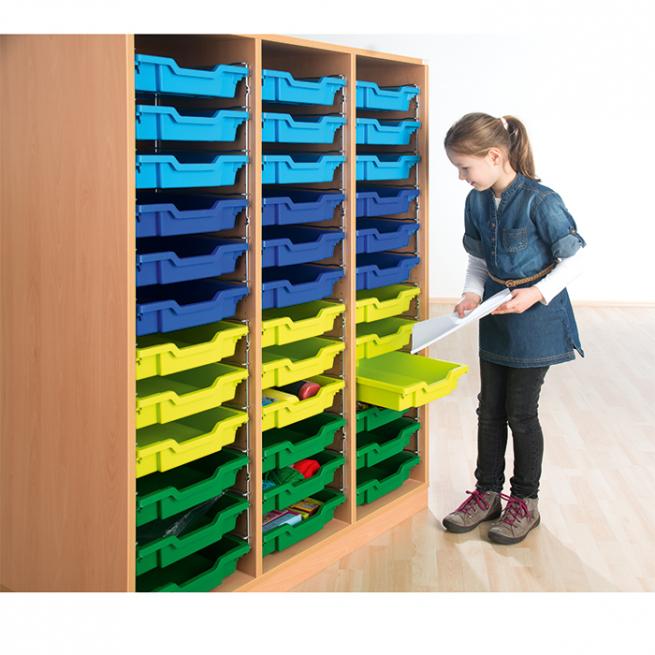 Übersichtlich, praktisch und robust: Hier bekommt jeder Schüler seine eigene Box. Dank der Sichtrückwand eignen sich die 3-reihigen, mittelhohen Regale auch hervorragend als Raumteiler.