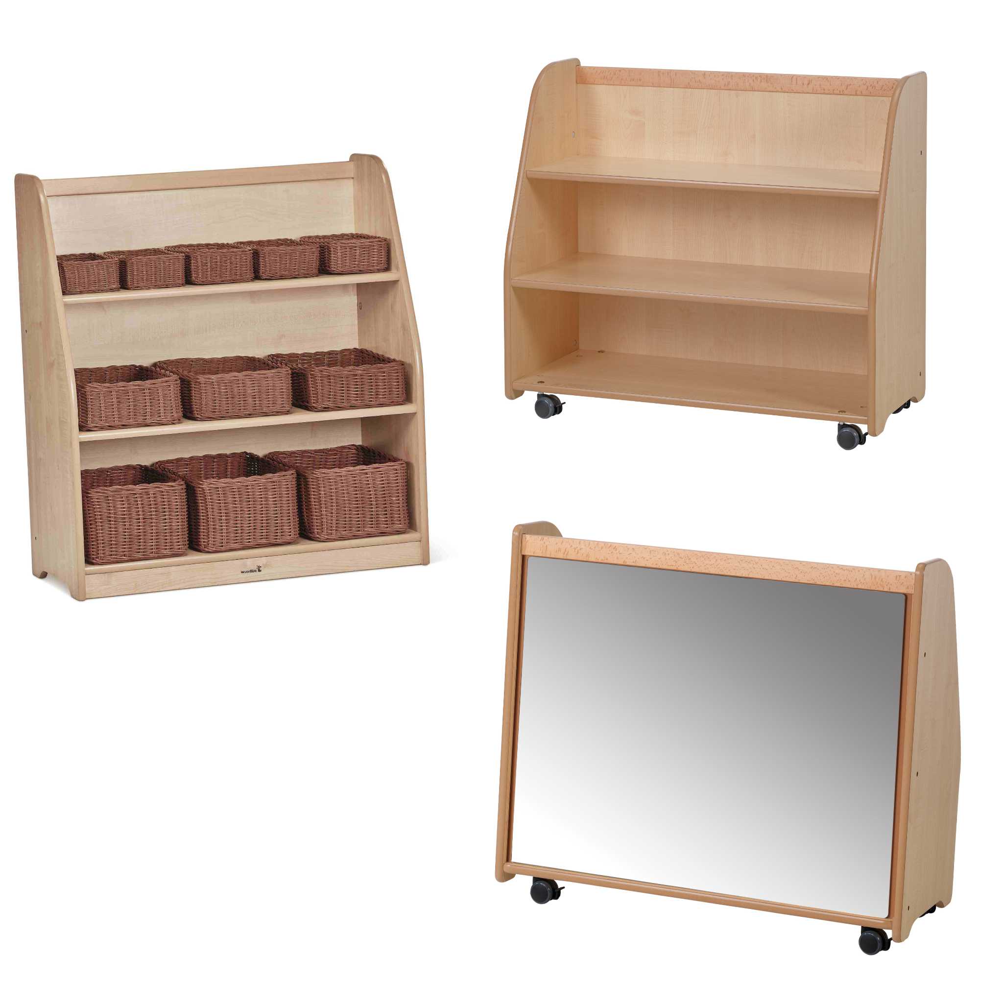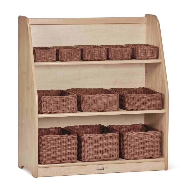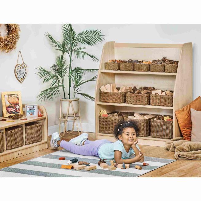 Praktische Lösung zur kompakten Aufbewahrung von Bastelmaterial, Spielzeug, Büchern & Co. Rückseite mit Acryl-Sicherheitsspiegel, per Klettverschluss abnehmbar. Belastbar bis 170 kg. Extra viel Stauraum dank hoher Regalfächer. Mit standfestem Sockel. Inklusive Ausstattung mit Rattan-Körben in verschiedenen Größen.
