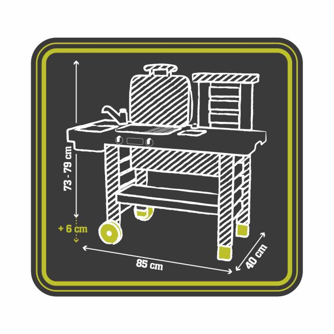 Küche und Utensilien bestehen aus UV-beständigem Kunststoff und bleiben langanhaltend farbecht. Dank zwei Rädern ist die Küchenzeile zudem leicht zu verschieben und findet stets einen passenden Aufstellort – ideal für den flexiblen Einsatz im Außenbereich.