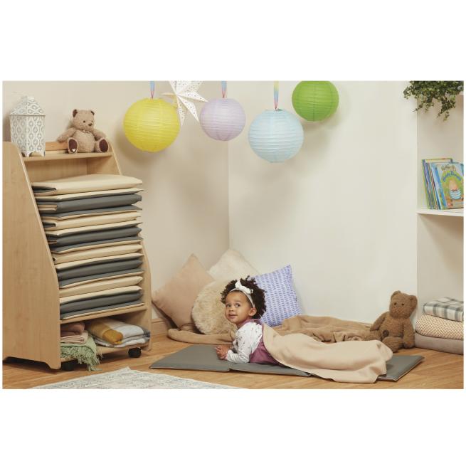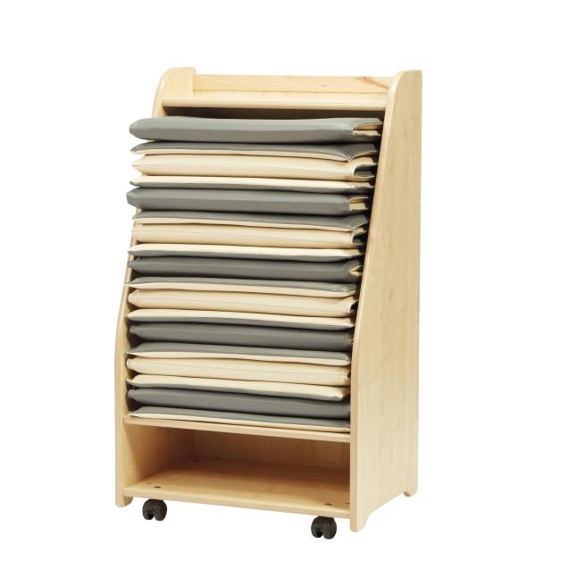 Die mobile Mattenaufbewahrung ist aus robustem Ahornmelamin gefertigt. Dies macht sie besonders langlebig und pflegeleicht. Einfach feucht abwischen. Der Mattenbezug ist ebenfalls leicht zu reinigen und überzeugt durch seine langlebigen Nähte. Zudem sind die Matten mit komfortablem Schaumstoff gefüllt, der gut stützt. Geeignet für Kinder ab 18 Monaten.
