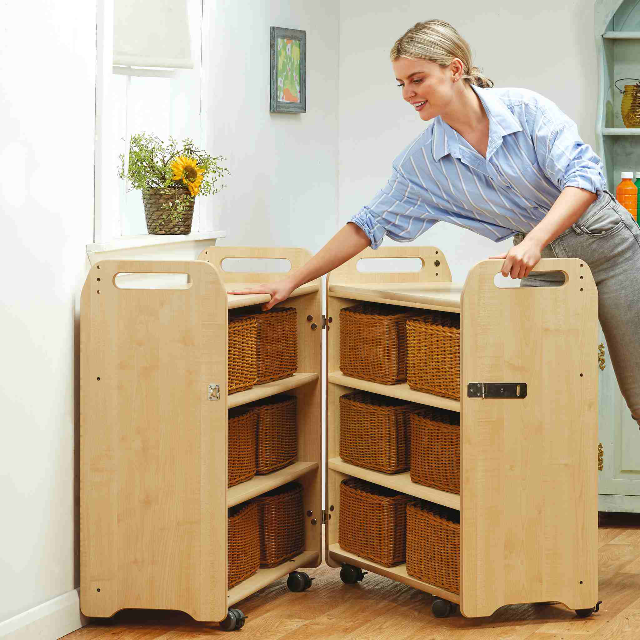 Das kompakte Organisations-Talent mit extra viel Stauraum. Klappen Sie den Schrank ganz einfach auf oder zu und fahren Sie ihn nach Gebrauch wieder zur Seite. Ideal für den flexiblen Einsatz. Zugeklappt verriegelbar, aufgeklappt ein prima Raumteiler. Mit feststellbaren und geräuscharmen Rollen, die Ihre Böden schonen. Stabile und robuste Konstruktion.