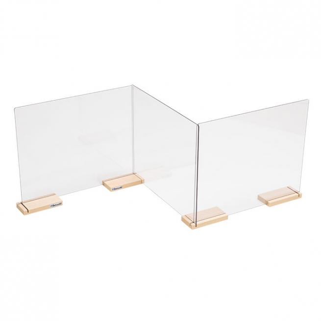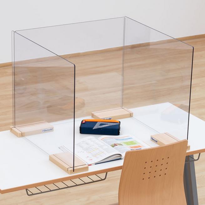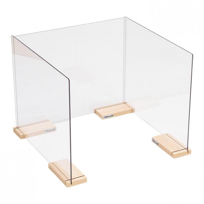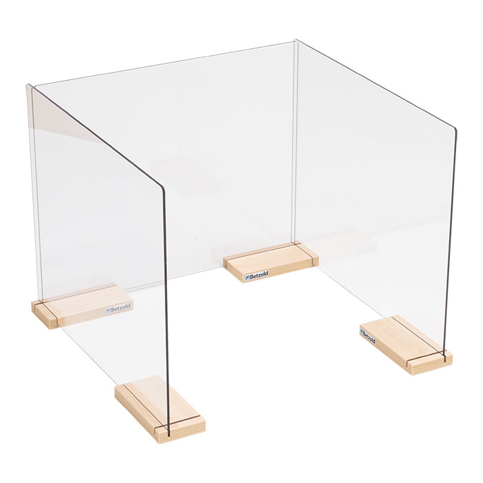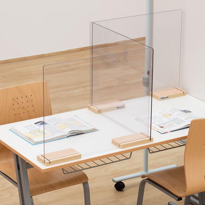 Schützen Sie Sitzplätze an Schülertischen mit dem mobilen Tröpfchenschutz aus 3 Polycarbonatplatten und 4 passenden Holzfüßen. Einfach in die Einkerbungen stecken. Reinigen Sie die Polycarbonatplatten mit herkömmlichen Desinfektionsmitteln.