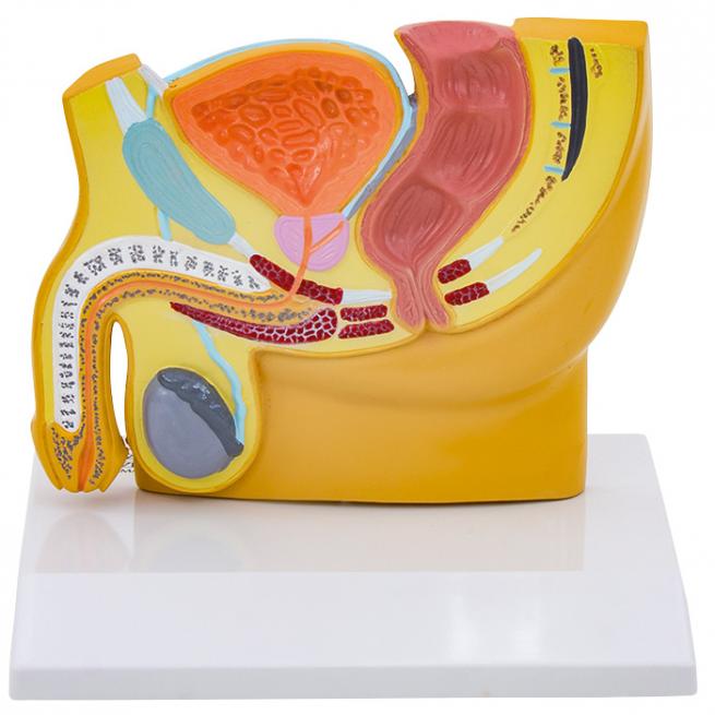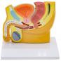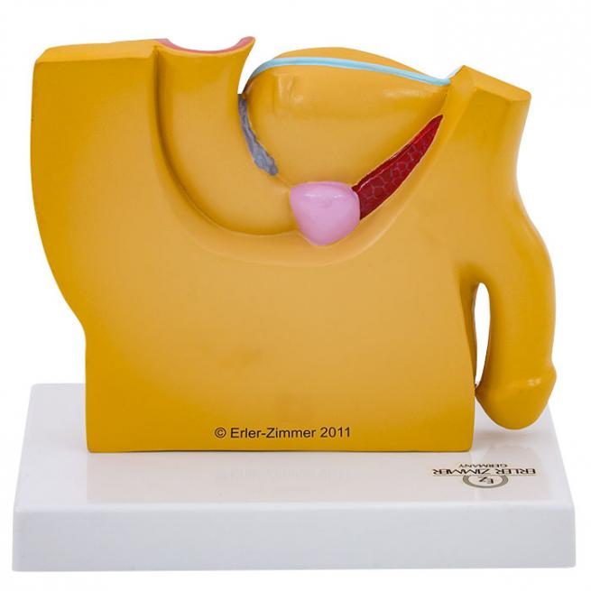 Die verkleinerten Medianschnitt-Modelle der menschlichen Becken in etwa halber natürlicher Größe zeigen die männlichen und weiblichen Geschlechtsorgane, die jeweilige Blase mit Harnleiter und Darmausgang sowie die Prostata. Ab 6 Jahren.