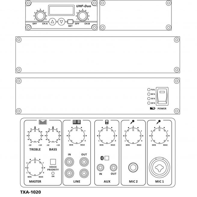 Transportables High-Power-Verstärkersystem. Die TXA-1020 nutzen Sie für den mobilen Einsatz bei Sportveranstaltungen, Vorträgen und sonstige größeren Events in Ihrer Einrichtung. Das leistungsstarke System verfügt über eine integrierte, einstellbare 2-Kanal-Multi-Frequenz-Empfängereinheit in UHF-PLL-Technik und Bluetooth-Empfänger für eine drahtlose Übertragung von Musik oder Sprache. Mit der Class D-Ausführung und 120 W Leistung bietet die TXA-1020 einen optimalen Wirkungsgrad.