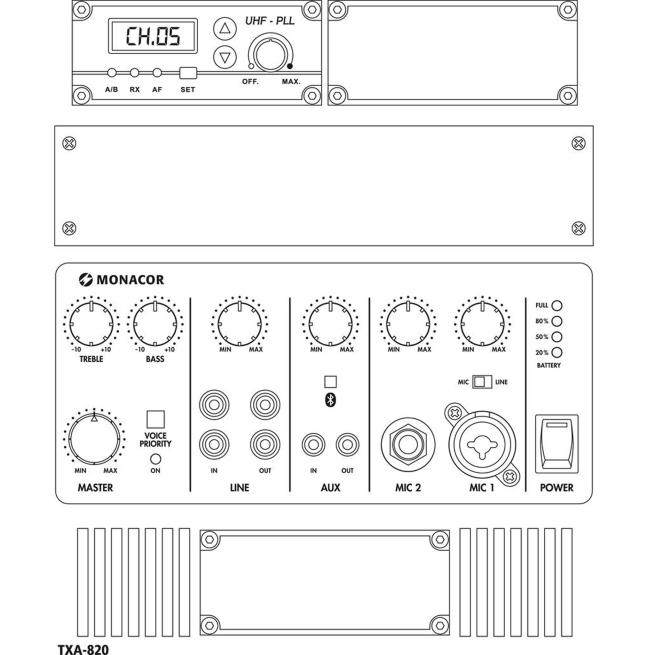 Transportables Verstärkersystem. Die TXA-820 nutzen Sie für den mobilen Einsatz bei Sportveranstaltungen, Vorträgen und sonstige größeren Events in Ihrer Einrichtung. Das leistungsstarke System verfügt über eine integrierte, einstellbare Multi-Frequenz-Empfängereinheit in UHF-PLL-Technik und Bluetooth-Empfänger für eine drahtlose Übertragung von Musik oder Sprache.