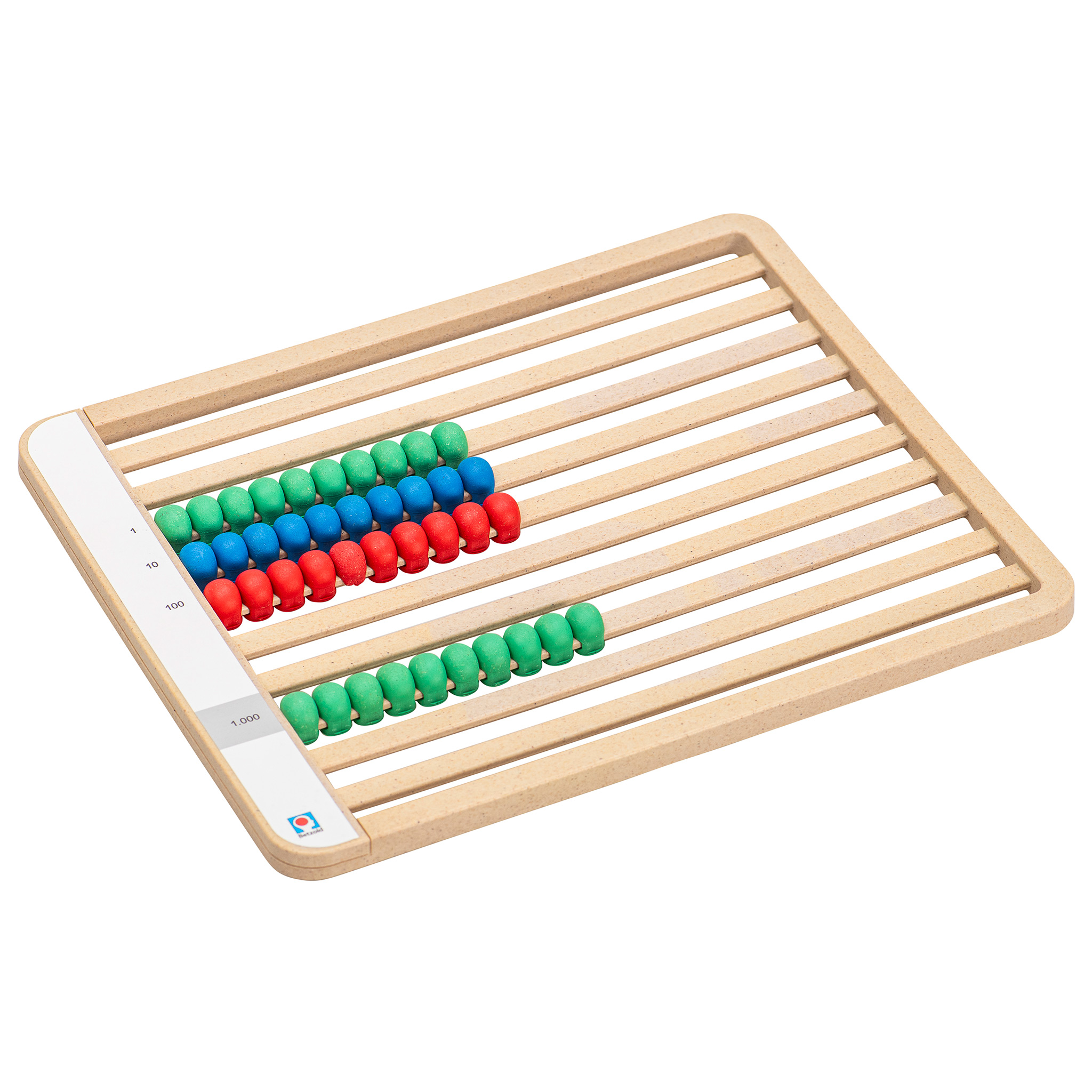 Mit dem Montessori-Rechenrahmen für den ZR bis 1.000 lernen Kinder von 7 – 10 Jahren anschaulich das Zählen und Rechnen. Der Rahmen besitzt 4 Reihen mit Schiebeperlen, wobei jede Reihe einem festen Wert entspricht (1er, 10er, 100er und 1.000er). Die Farbkodierung der Perlen folgt dabei dem Montessori-Prinzip: 1er in Grün, 10er in Blau, 100er in Rot und die 1.000er wieder in Grün. Das macht die mathematischen Übungen am Rechenrahmen visuell exzellent nachvollziehbar. Addition, Subtraktion, Multiplikation und Division gelingen im Nu. Die Schiebeperlen besitzen eine speziell an Kinderhände angepasste Größe und Haptik und lassen sich leicht bewegen – so macht das Rechnen Spaß! Der Rechenrahmen ist bestens mit anderen Montessori-Lernmitteln kombinierbar, ideal zur nahtlosen Integration in Ihren Materialbestand. Hergestellt aus treeNside-Material – haltbar, leicht und umweltfreundlich.
