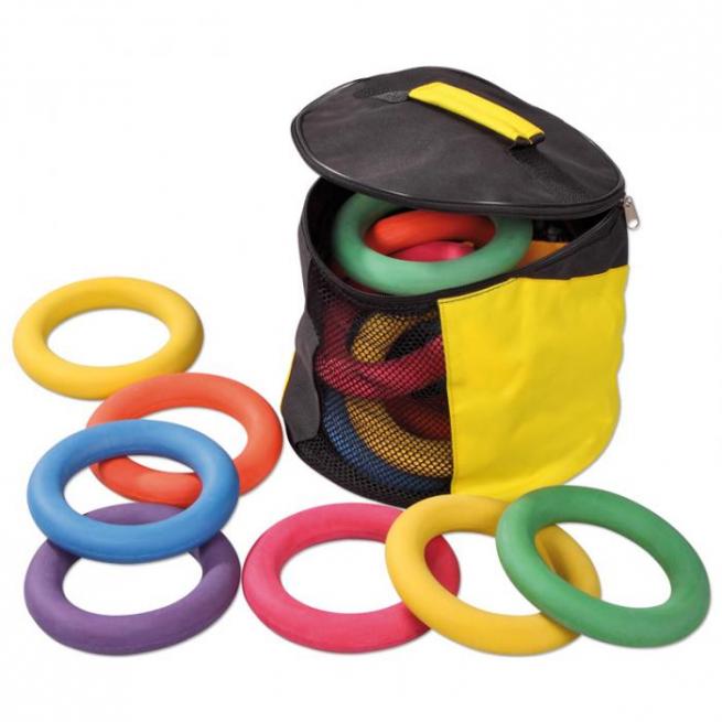 Im Set enthalten sind 15 Moosgummi-Ringe und eine praktische Tasche (100% Nylon) mit Netzeinsatz für optimale Durchlüftung. Die Ringe sind vielseitig einsetzbar – zum Werfen und Rollen im Sportunterricht oder an der Wasseroberfläche schwimmend im Schwimmunterricht.