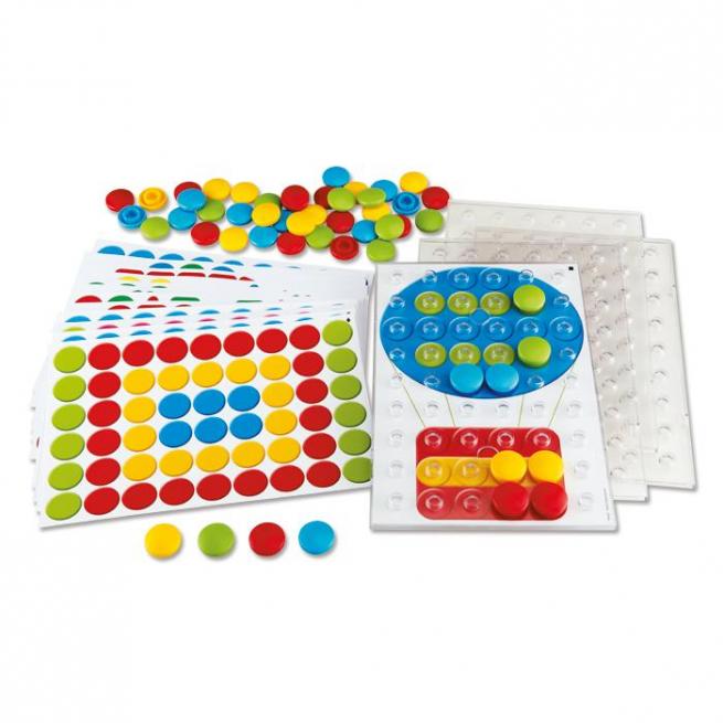 Vier Kinder spielen mit diesem farbenfrohen Steckspiel gleichzeitig. Die Handhabung ist kinderleicht: Einfach eine Vorlagekarte unter das transparente Gitter stecken und schon beginnt das (Nach-)Stecken. Mit leichtem Druck halten die Steine auf dem Gitter.