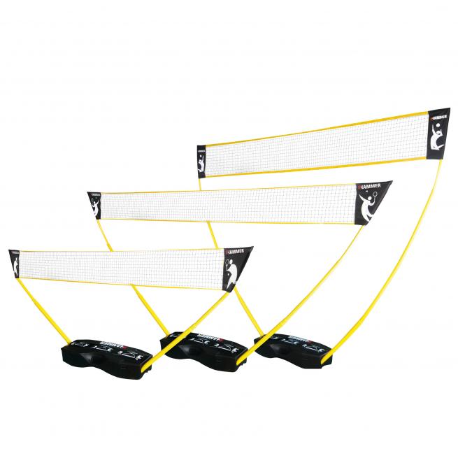 Schnell aufgebaut und handlich zu transportieren. Dank der variablen Netzpfosten schaffen Sie im Handumdrehen ein Spielfeld für Volleyball (2,24 m Netzhöhe), Badminton (1,55 m Netzhöhe) oder Tennis (1,02 m Netzhöhe). Der stabile Transportkoffer dient als Netz-Basis.