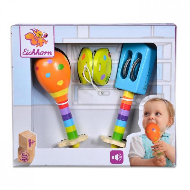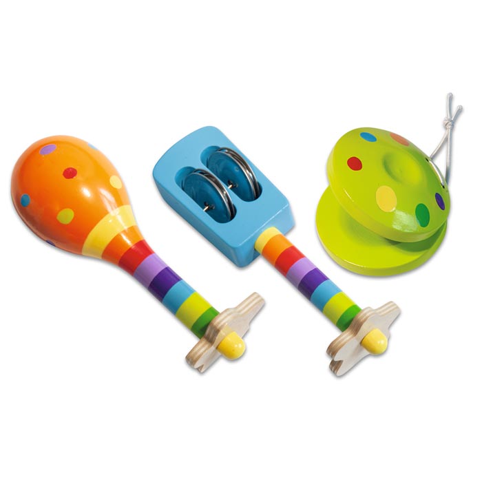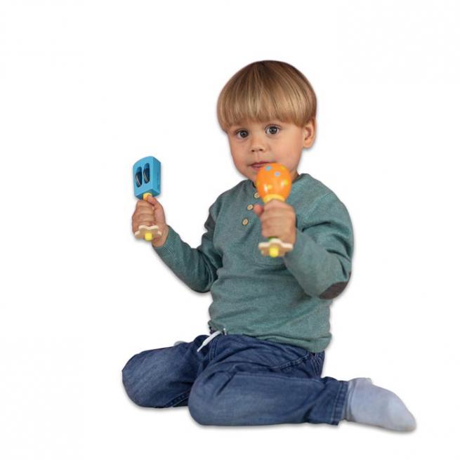 Kunterbuntes Trio für super Effekte. Schon kleine Kinder ab 1 Jahr lernen mit der Rassel, der Kastagnette und der Maraca Rhythmusinstrumente mit unterschiedlichen Klängen kennen. Die bunten Farben animieren zum Zugreifen und Ausprobieren.