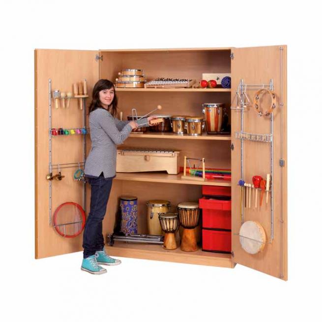 Mit 3 verstellbaren Böden (25 mm stark) und integriertem Container mit 2 flachen und 2 hohen Boxen für Kleinteile. An den Türinnenseiten sind Halterungen für Kleininstrumente angebracht. Die Schränke sind verschließbar. Die Schranktiefe von 60 cm erlaubt es, Glockenspiele, Xylophone usw. breitseits einzustellen. Ohne Instrumente.