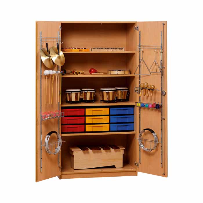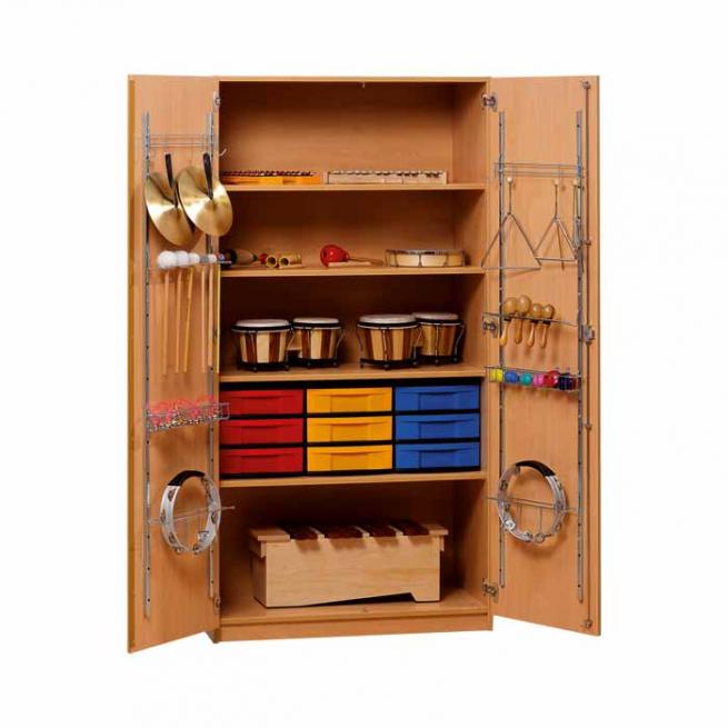 Bestens aufgeräumt und geschützt sind die Schulinstrumente für Ihren Musikunterricht in diesem zweitürigen Schrank mit 4 Böden, von denen Sie 2 verstellen können. Schlägel, Effekt- und Rhythmusinstrumente hängen Sie bequem in die Halterungen an den Türen. Zusätzlichen Stauraum erhalten Sie durch die optionalen flachen oder hohen Boxen in Ihrer Wunschfarbe. Abschließbar durch ein 3-Punkt-Zylinderschloss. Die Schranktiefe von 60 cm erlaubt es, Glockenspiele, Xylophone usw. breitseits einzustellen. Lieferung ohne Instrumente.