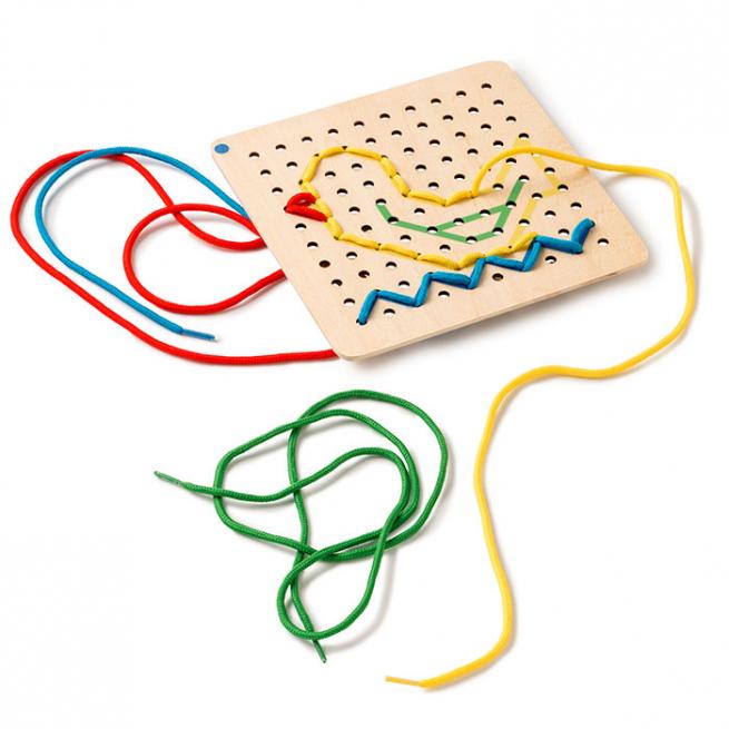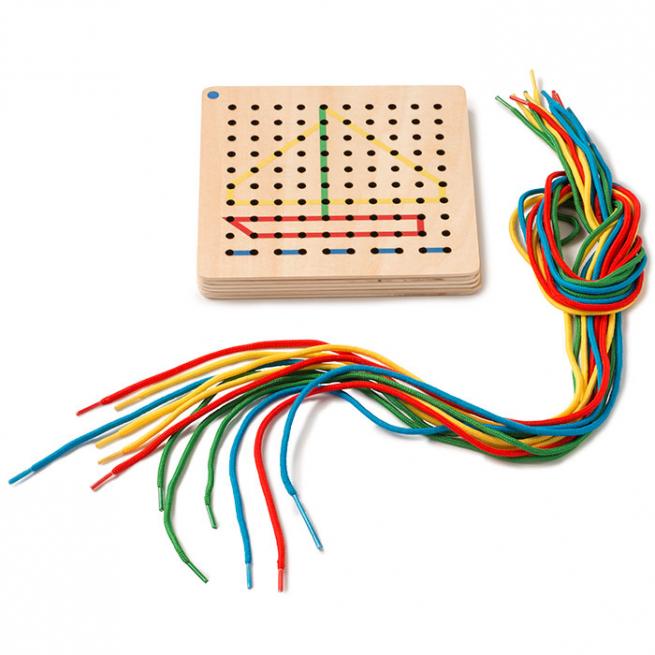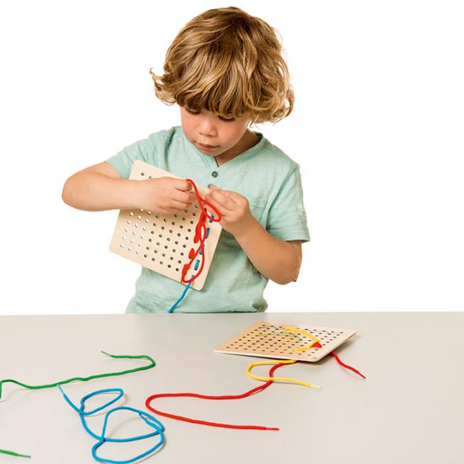 Wenn die Kinder die Muster der Aufgabenkarten mithilfe der verschiedenfarbigen Schnüre nachfädeln, trainieren sie ihre feinmotorischen Fähigkeiten. Die Blankokarte bietet Platz für eigene kreative Gestaltungsformen.
