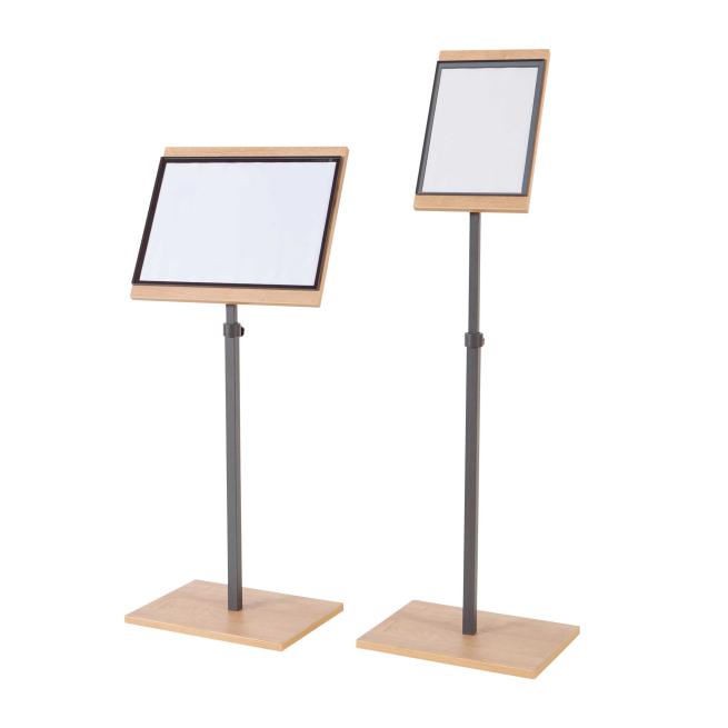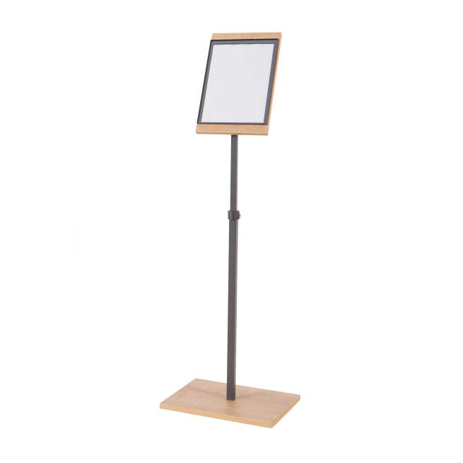 Diese Infoständer setzen Ihre Infos in den Formaten DIN A3 oder DIN A4 stilvoll in Szene. Die edle Eiche-Optik sorgt für eine ansprechende Präsentation, während die drehbare Tafel eine flexible Nutzung im Hoch- oder Querformat ermöglicht. Die Höhe passen Sie bequem an, von 102 bis 150 cm – optimal für vielseitige Einsatzbereiche in Schulen, Kitas oder Empfangsbereichen. Ideal auch als Infotafel, Rednerpult oder Präsentationshilfe.