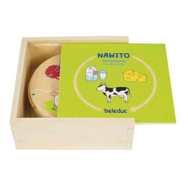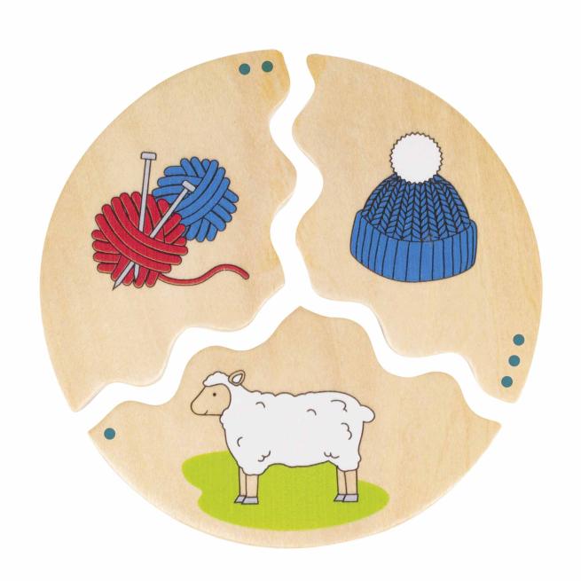 Die 3-teiligen, runden Puzzles vermitteln Kindern ab 4 Jahren auf kindgerechte Weise, wie Produkte wie Wolle, Schokolade oder Käse entstehen und verarbeitet werden. Durch die Unterstützung von Punkten zur Erkennung der Reihenfolge und das Zusammenfügen passender Teile fördern die Puzzles das logische Kombinieren und das Verständnis von Fertigungsprozessen.