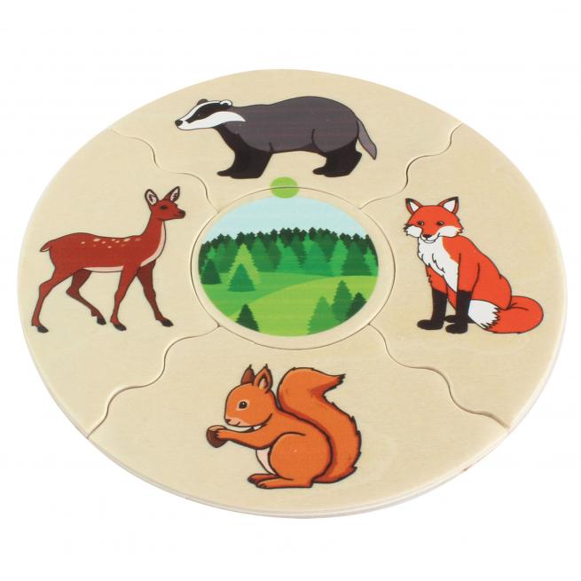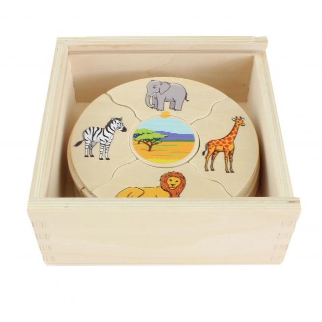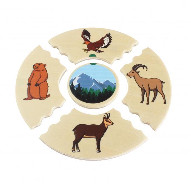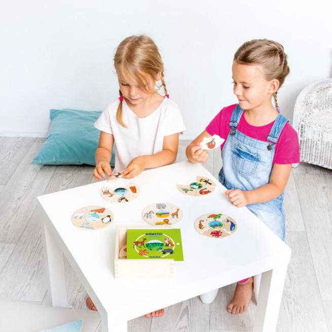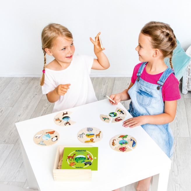 Wo lebt denn der Steinadler? Welche Tiere leben in der Savanne? Gibt es in der Wüste auch Tiere? All das und noch viel mehr entdecken die Kinder mit diesem Tierwelten-Puzzle-Set. Sie lernen insgesamt 9 Lebensräume (Hochgebirge, Savanne, Wüste, Wiese, Wald, Ozean, Fluss, Nord- und Südpol, Regenwald) und 36 verschiedene Tierarten kennen. Die gut greifbaren Holzpuzzles bestehen aus jeweils 5 Teilen. Immer 4 Tiere passen zu einem Lebensraum.