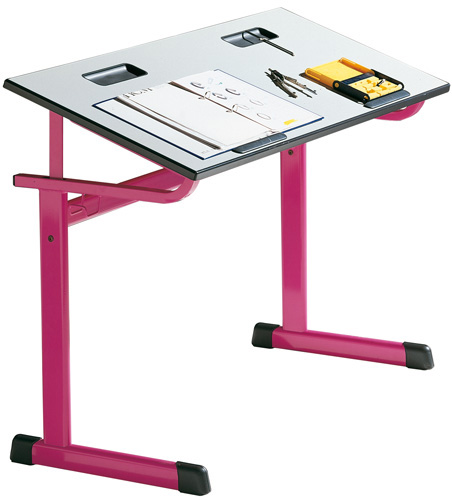 30° neigbare Arbeitsplatte. Tischplatte mit PUR Kante. Die Schüler bestimmen die Neigung selbst. Mögliche Neigungswinkel sind 0°, 10°, 20° und 30°. Sehr einfache und geräuscharme Bedienung. Die geneigte Arbeitsplatte bewirkt eine orthopädisch gewollte Haltung.