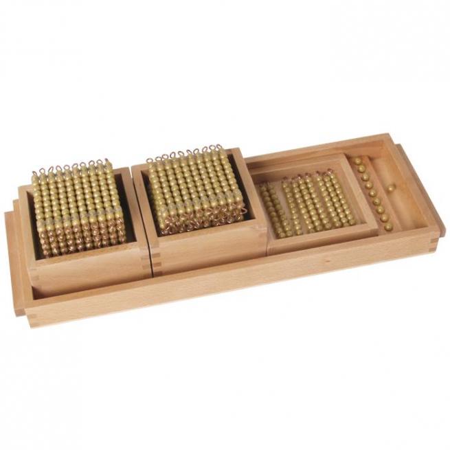 9 lose Kunststoffperlen, 9 Zehnerstangen à 7 cm, 9 Hunderterplatten à 7 cm2 und 1 Tausenderkubus à 7 cm3 befinden sich im Holzkasten. Für die losen Perlen (Einer) steht ein Zählbrett mit Bohrungen zur Verfügung.