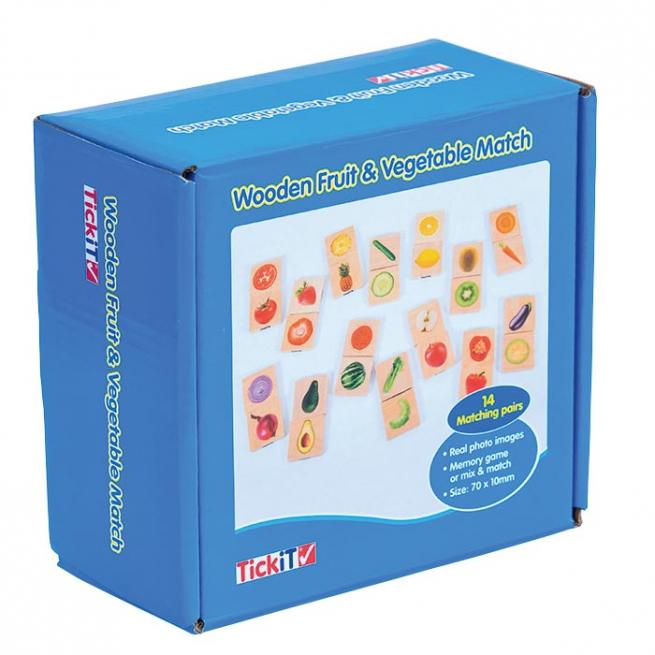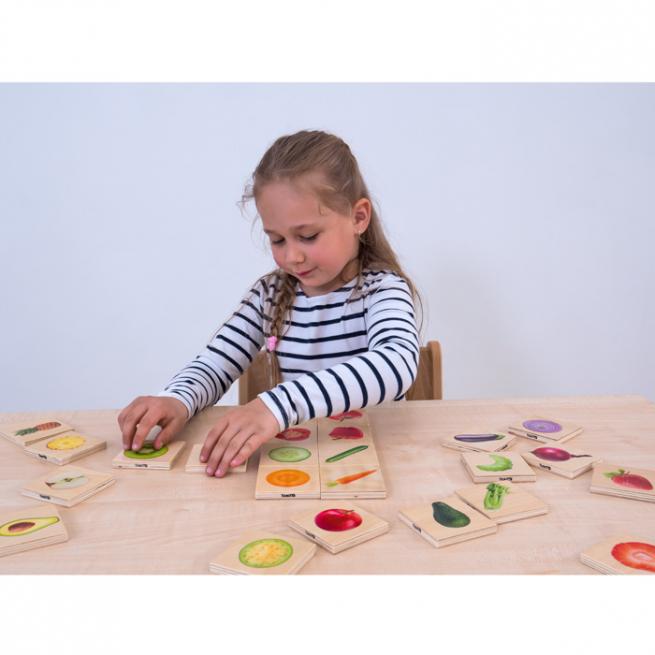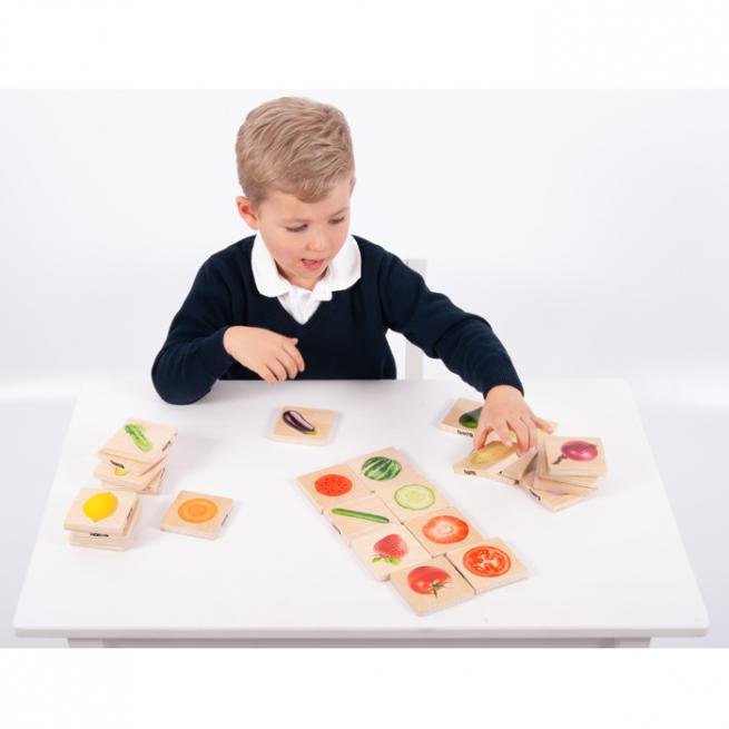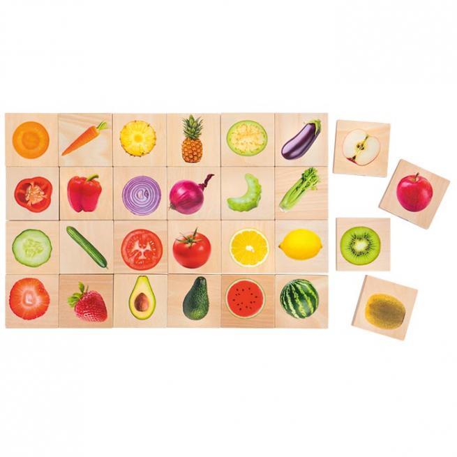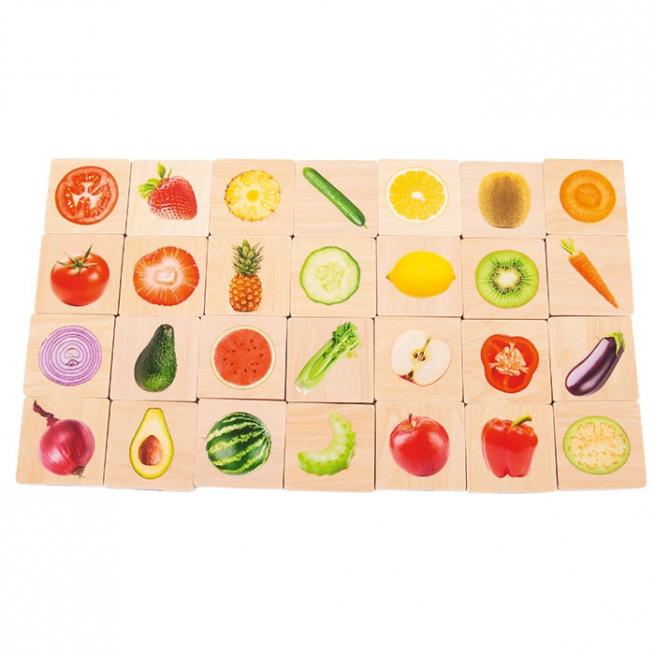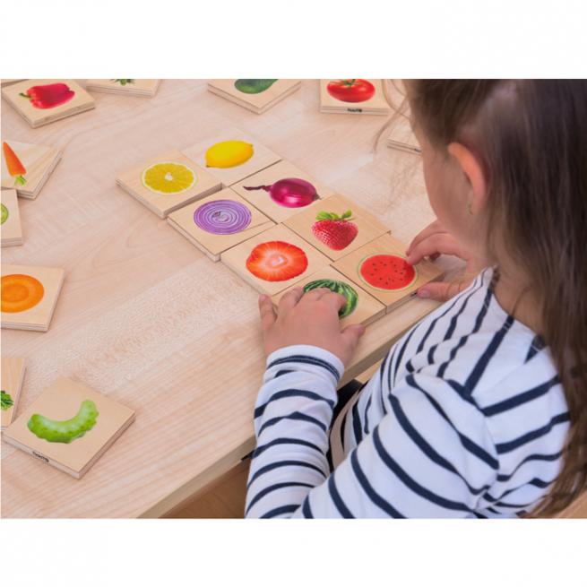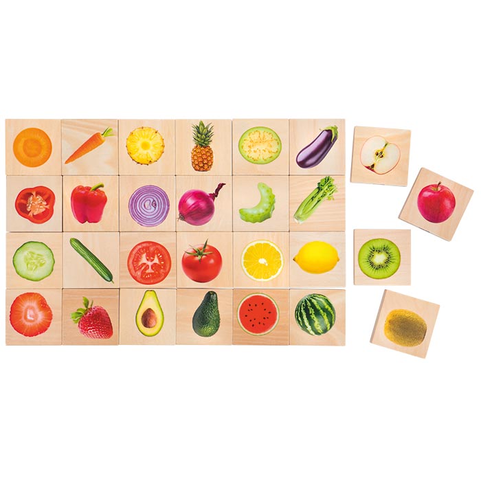 Wie Obst und Gemüse im Ganzen bzw. durchgeschnitten aussieht, lernen Ihre Kinder spielend mit diesem Memory-Spiel. Die 28 Holzkarten mit den bedruckten Fotos der 14 Obst- und Gemüsepaare sind für Kinderhände gut zu greifen.