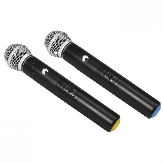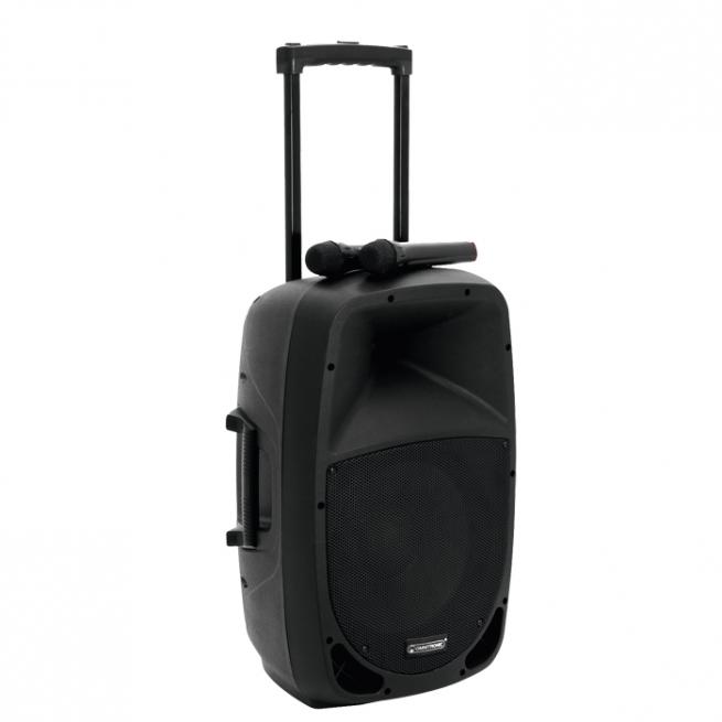 Tragbares PA-System mit 2 Ultrahochfrequenz-Funkempfängern, Audioplayer und Bluetooth. Dieses System steuern Sie über Bluetooth an. Das Set bietet alles, was Sie in- und outdoor für gelungenes Entertainment brauchen. Über das Mikrofon moderieren Sie Veranstaltungen oder lassen die Kinder als Karaoke-Künstler antreten.