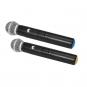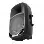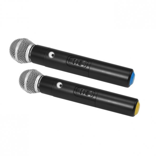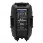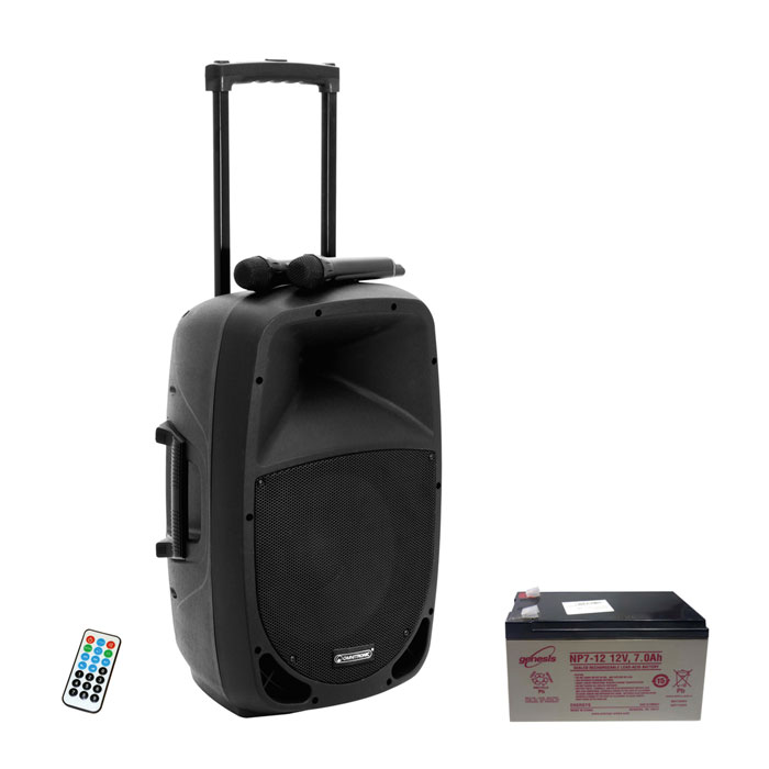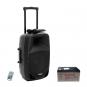 Tragbares 15"-PA-System mit 2 Ultrahochfrequenz-Funkempfängern, Audioplayer und Bluetooth. Dieses Set enthält neben einem MP3-Player auch einen SD-Karten-Steckplatz und einen USB-Anschluss. Über den Stereo-Eingangskanal schließen Sie auch CD-Player oder Laptops an.