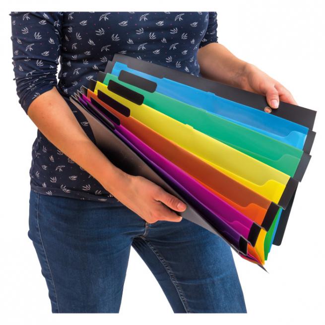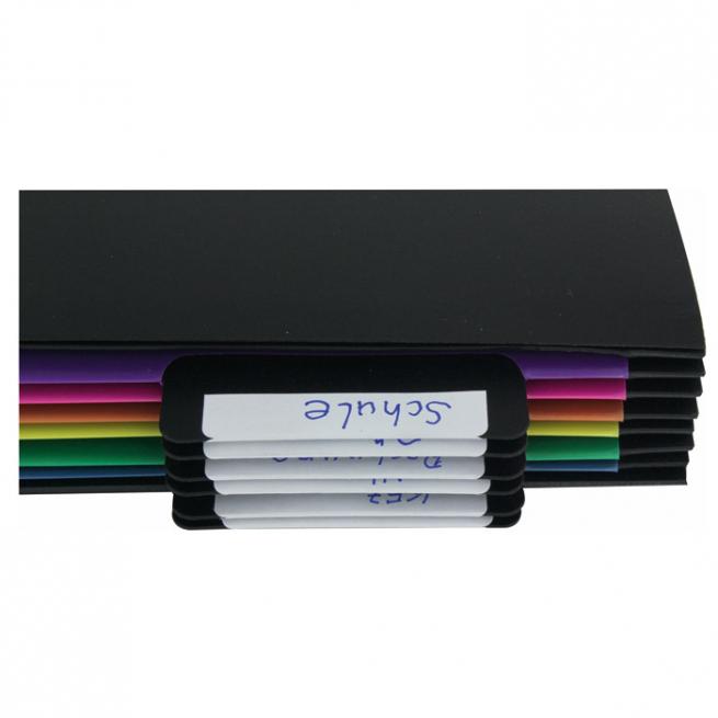 Die Mappe mit 6 Fächern und 12 Etiketten hängen Sie bei Bedarf einfach auf. Ihre Unterlagen bis DIN A4 plus sind darin gut sortiert. Mit Ösen und Eckspanngummis.