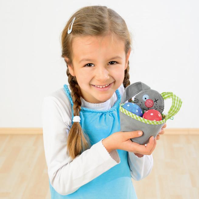 Niedliches Osterkörbchen aus Stoff im frechen Hasen-Design. Hier haben kleine Überraschungen, Ostereier oder auch Leckereien Platz. Die Hasenohren dienen gleichzeitig als Henkel. Ab 3 Jahren.