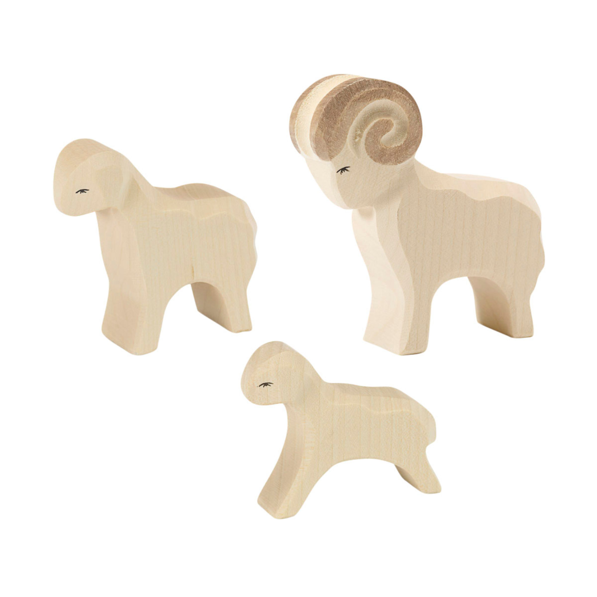 Mit Widder, Mutterschaf und Lamm spielen Kinder Szenen von Wiese, Weide und Feld: Der imposante Widder zeigt seine mächtigen Hörner, das Mutterschaf strahlt Ruhe aus, das Lamm hoppelt mit weichem Fell über die „Weide“. Greifen Sie diese Merkmale auf, lassen Sie Kinder beschreiben, vergleichen und erzählen. So wächst neben der Fantasie auch das Sachwissen.