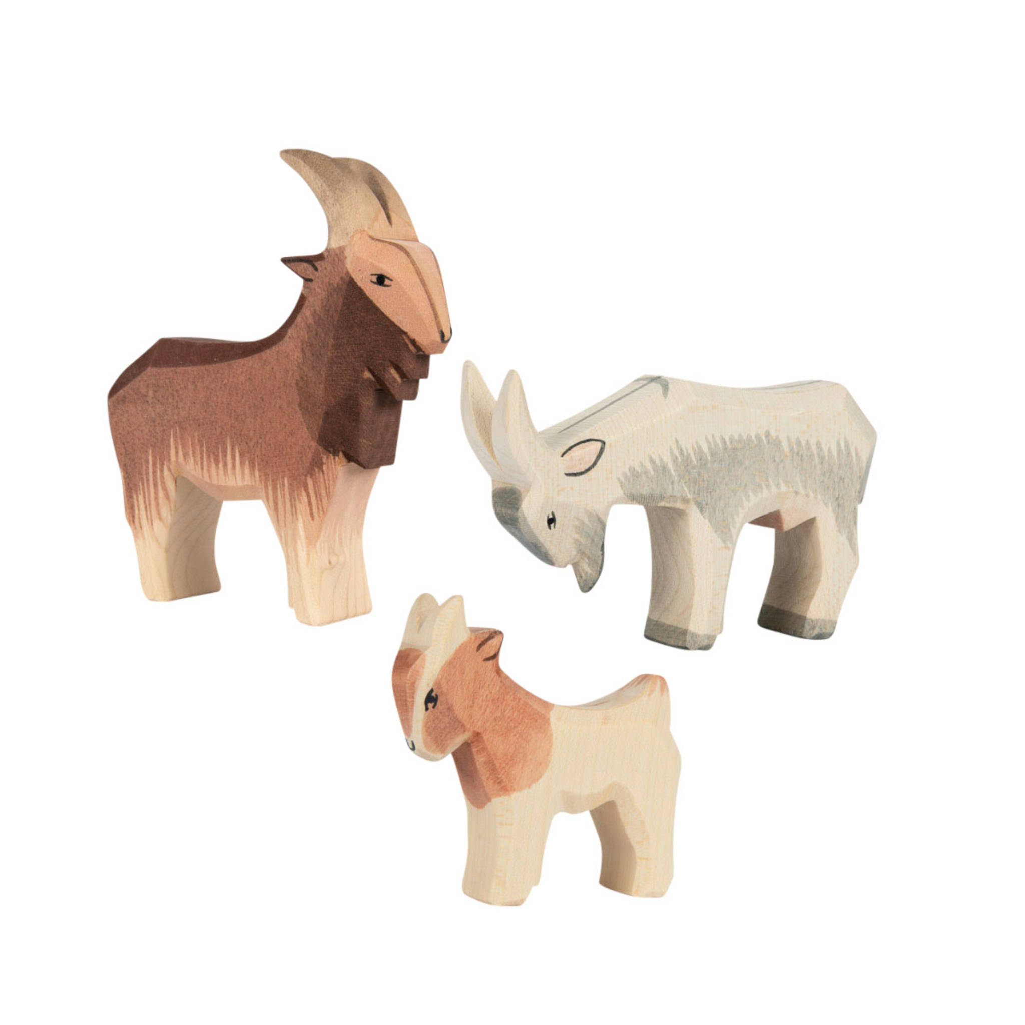 Würdig, verspielt, übermütig, hingebungsvoll, scheu – diese Ziegengruppe bringt jede Menge Charakter ins Rollenspiel. Stellen Sie mit Kindern Almwiesen, Felsen und Gebirgshänge nach, verteilen Sie Rollen und starten Sie direkt ins freie Spiel: Der stattliche Ziegenbock zeigt seine geschwungenen Hörner, die weiß-graue Ziegenmutter trägt den kleinen Bart am Kinn, das braun gefleckte Zicklein knabbert Kräuter oder springt über imaginäre Steine.