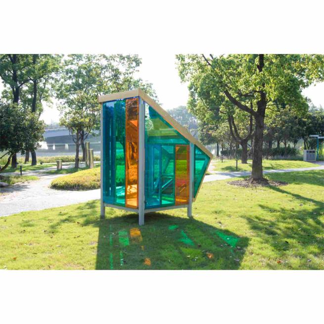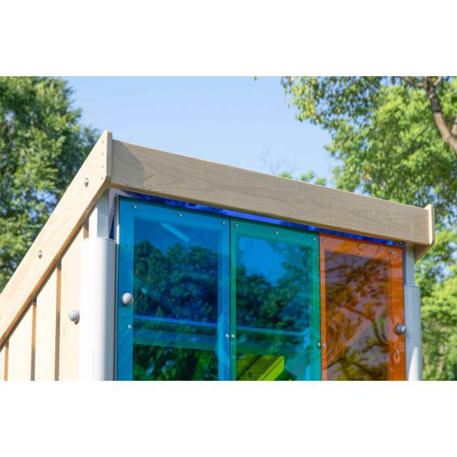 Orientiert an der lichtdurchfluteten Architektur der Moderne, präsentiert sich das Outdoor-Farbenhaus als herausragender Blickfang. Die Verwendung bruchfester, verschiedenfarbiger und UV-beständiger Polycarbonatfenster zu allen Seiten erzeugt ein herrliches Farbenspiel und macht das Häuschen schnell zum beliebten wie sicheren Treffpunkt der Kinder. Das fröhliche und kinderfreundliche Design motiviert zum ausgelassenen Erkunden und Bespielen. Dabei vermittelt das bunte Häuschen eine fantasieanregende Wohlfühlatmosphäre, die gleichermaßen zu spannenden gemeinsamen Rollenspielabenteuern sowie gemütlichen Lesestunden und Träumereien einlädt.