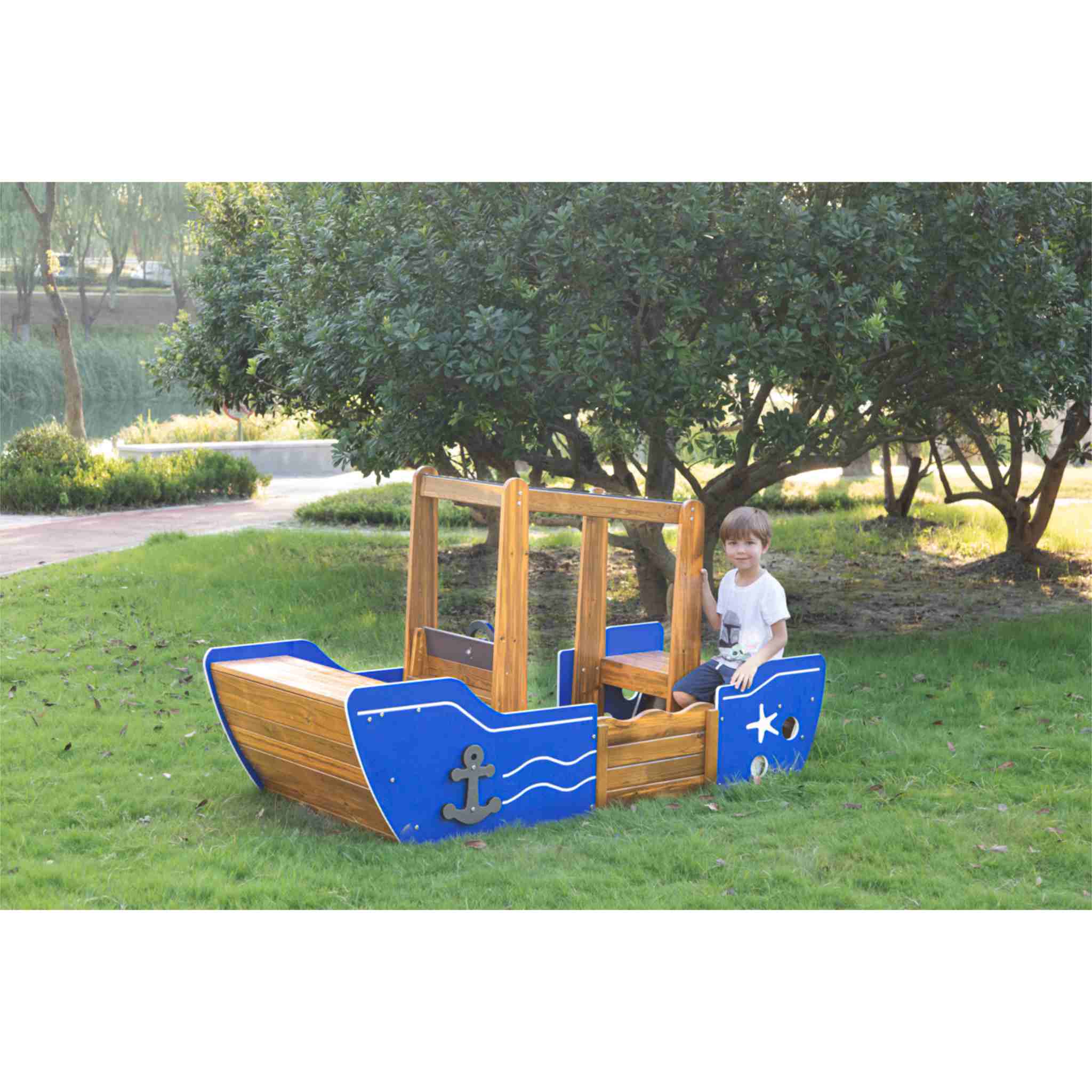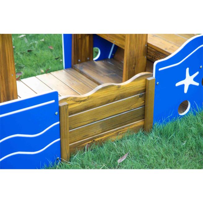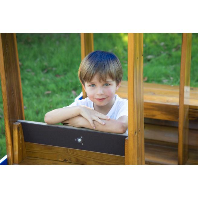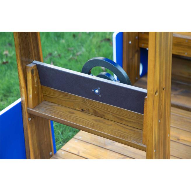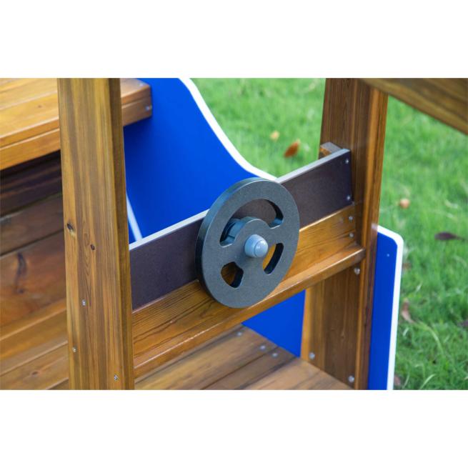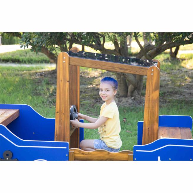 Konzipiert für die feste Aufstellung, wartet es mit spannenden Gestaltungselementen auf, welche die Kinder die Welt um sie herum rasch vergessen und auf spannende Rollenspielabenteuer Kurs setzen lassen: Die kleine Steuerkabine samt simuliertem Steuerrad setzt stimmungsvolle Reize und motiviert die Kinder zum vielseitigen Bespielen. Dabei ist das Kabinendach ein praktischer Regenschutz, bestehend aus bruchsicherem, lichtdurchlässigem Polycarbonat in Blau.