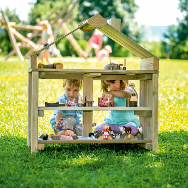 Allerlei spannende Geschichten lassen Ihre Kinder auf den 3 Ebenen des robusten Puppenhauses lebendig werden. Beidseitig bespielbar und optimal für den Einsatz im Außenbereich. Zur einfachen Selbstmontage.