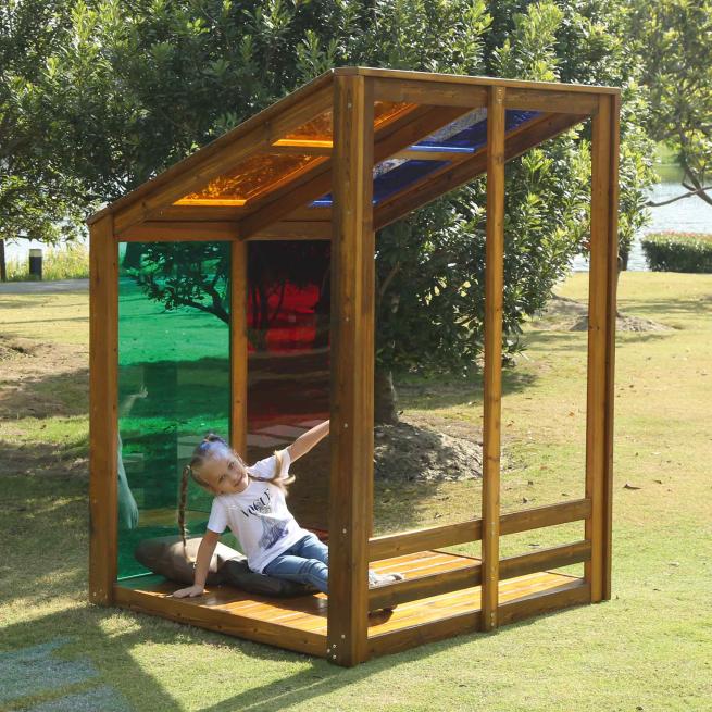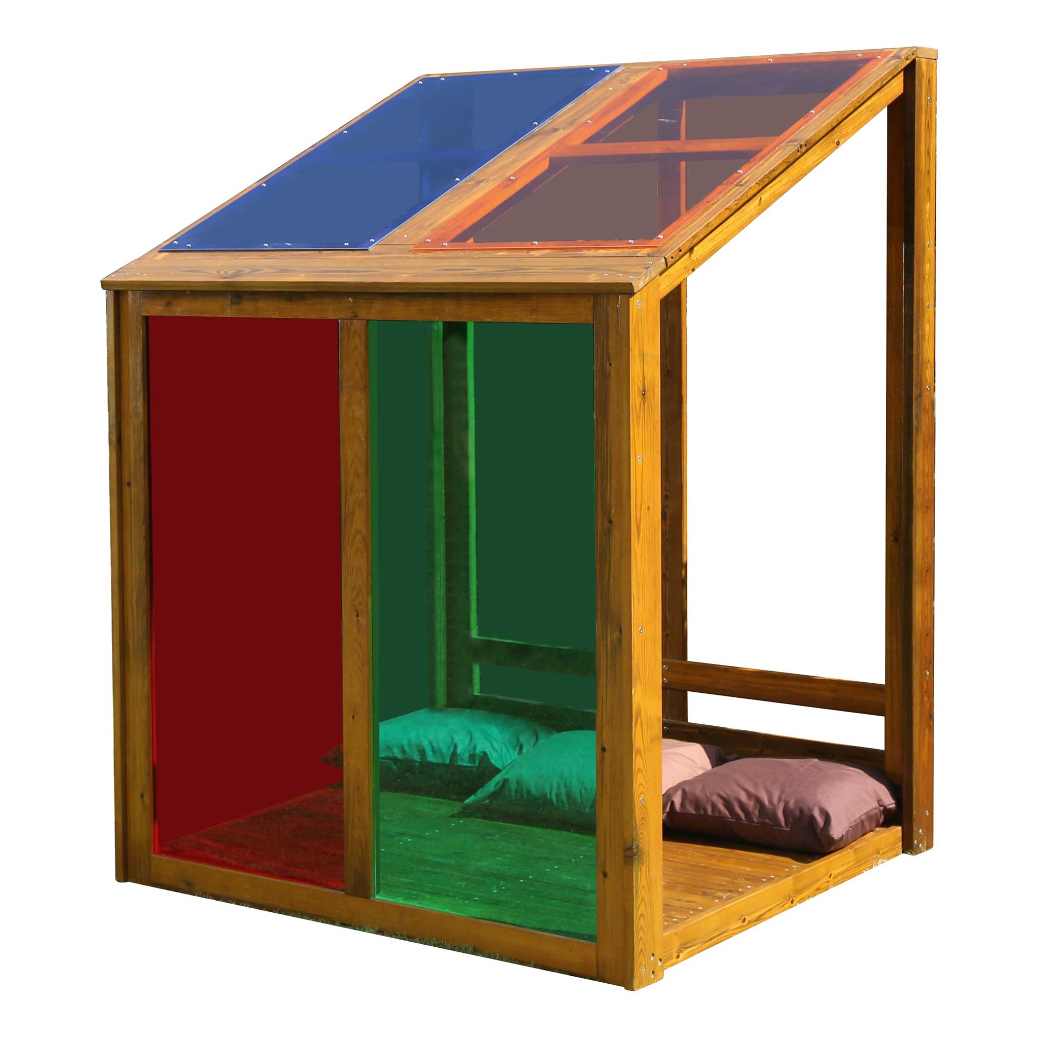 Fantastische Lichtspektakel beobachten Ihre Kinder durch die vier farbigen Fenster in diesem Outdoor-Regenbogenhaus. Das Dach ist mit einer gelben und einer blauen Acrylglasplatte gedeckt. Die Wand darunter hat eine rote und grüne Verglasung. Wenn die Sonne hindurchscheint, entstehen tolle Farbeffekte. Zur einfachen Selbstmontage. Teilmontiert. 5 Jahre Herstellergarantie.