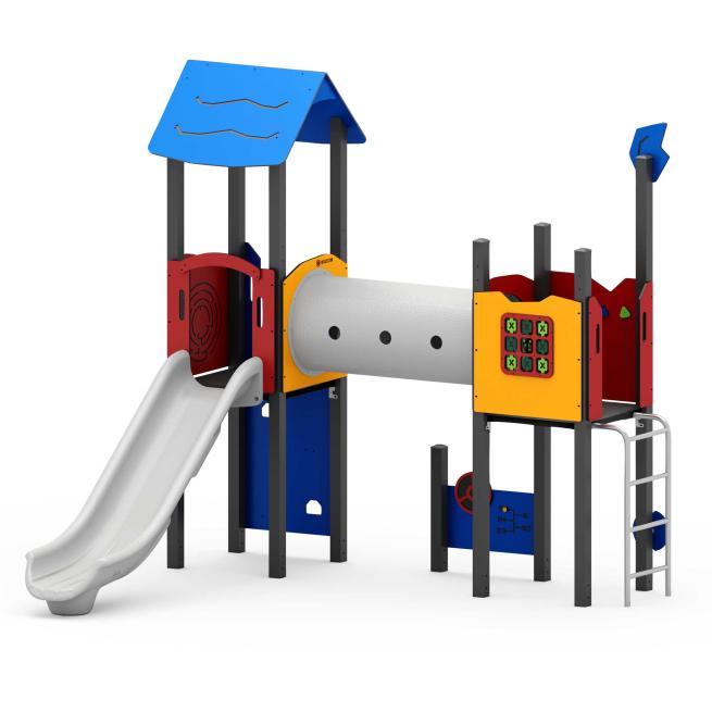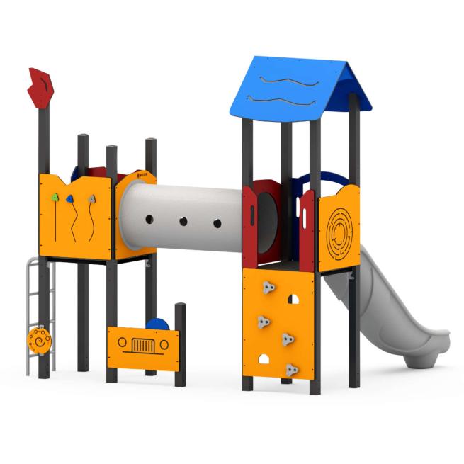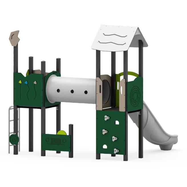 Die modulare Outdoor-Spielanlage Kletterstädtchen bietet einen abwechslungsreichen Mix aus Kletter- und Spiele-Elementen. Während die einen Kinder die Kletterwand erklimmen oder den Kriechtunnel erkunden, probieren sich die anderen am Tic-Tac-Toe-Spiel oder als kleine Rennfahrer. Danach geht es rasant die Rutsche hinunter!