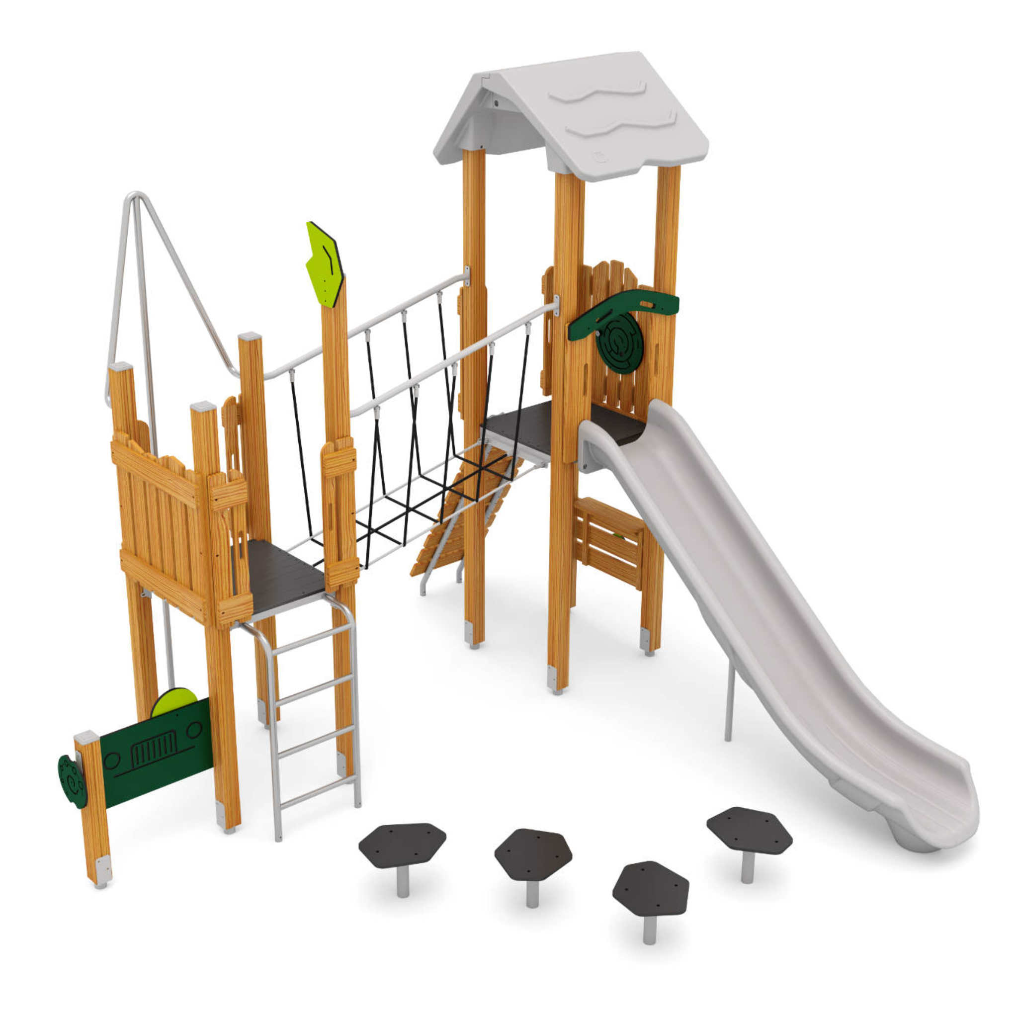Eintauchen in spannende Rollenspielwelten: Gestaltet wie ein aufregendes Geheimversteck auf einer einsamen Insel, warten hier besondere Highlights für das passende Abenteuerflair. Die Netz-Hängebrücke, der Felsen-Trittparcours oder die extralange Rutsche (150 cm) halten die Kinder zuverlässig in Action. Und auch verschiedene weitere Elemente, darunter lustige Spielapplikationen und Kletteraufstiege, sorgen für anhaltende Spielfreude. Die Auslieferung erfolgt zur ortsfesten Montage, die Anlage von Fundamenten ist notwendig.