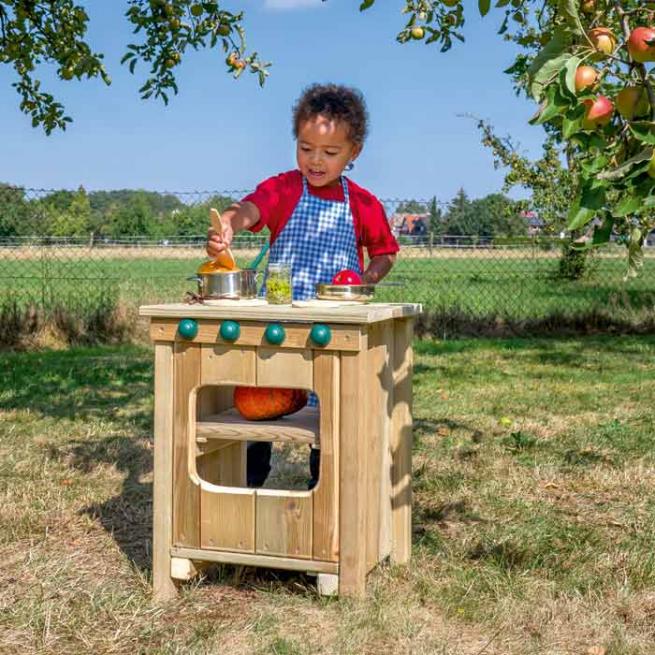 Auf der Gartenparty wird im Freien gekocht! Im Handumdrehen verlegen Sie die Spielküche bei schönem Wetter nach draußen. Die kompakten Spielgeräte sind äußerst stabil und bieten den kleinen Meisterköchen viele Möglichkeiten für fantasievolle Kreationen. Mit Herd, Spüle und Küchenblock stehen drei Module zur Auswahl, die sich beliebig kombinieren lassen. Einzeln aufgestellt spielen leicht mehrere Kinder beidseitig an einem Element. Lassen Sie eine große Kücheninsel entstehen, indem Sie vier Küchenblöcke zusammenstellen. Die Lieferung erfolgt teilmontiert.