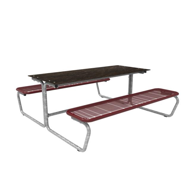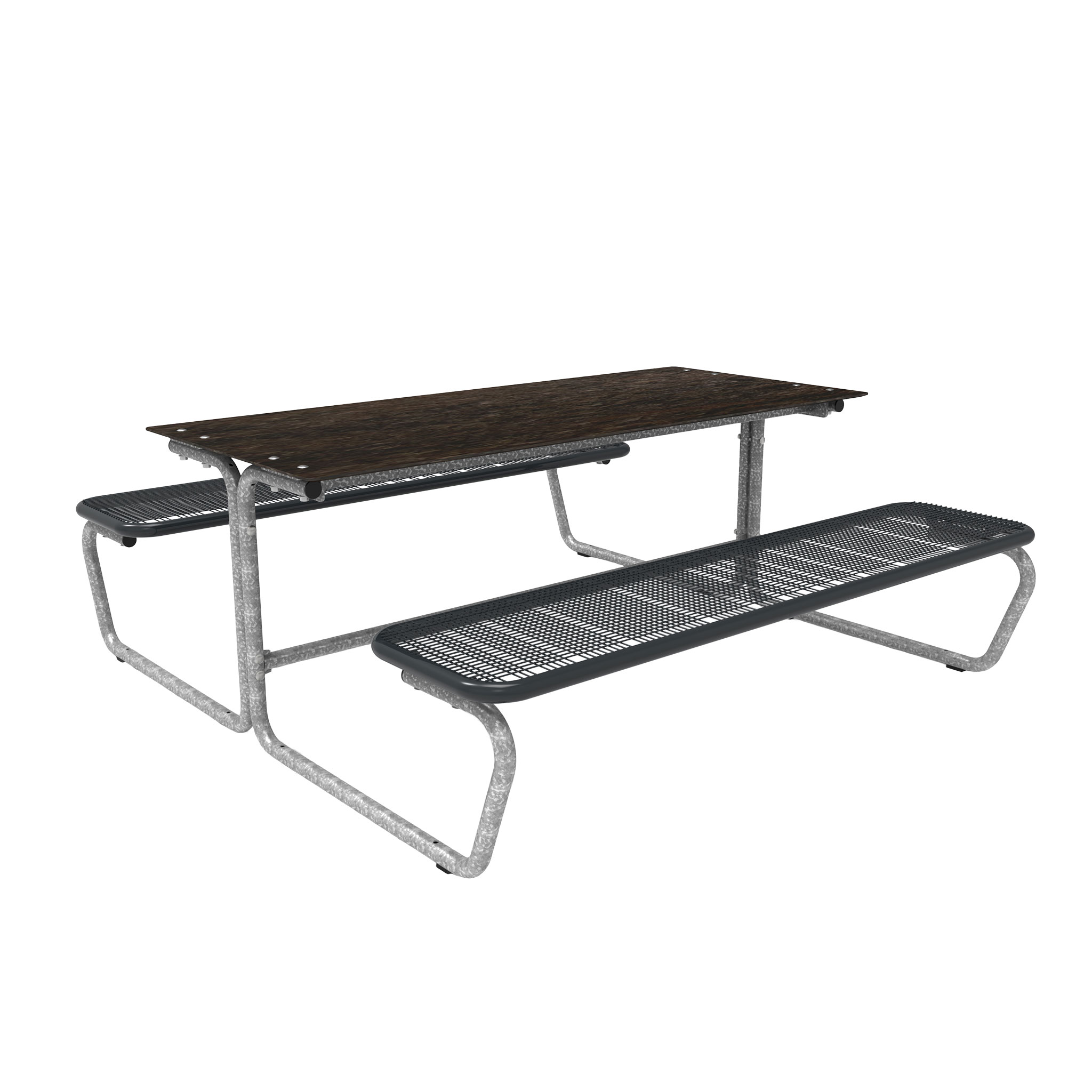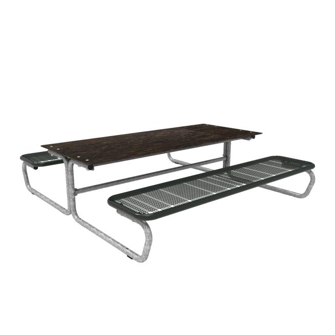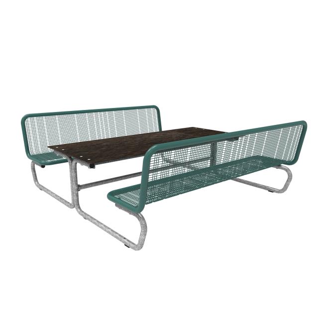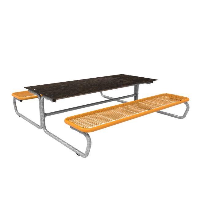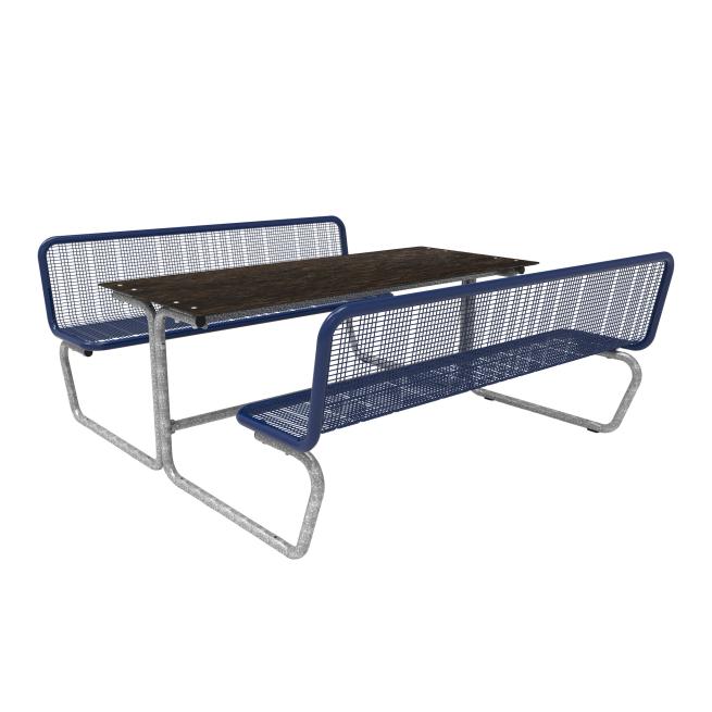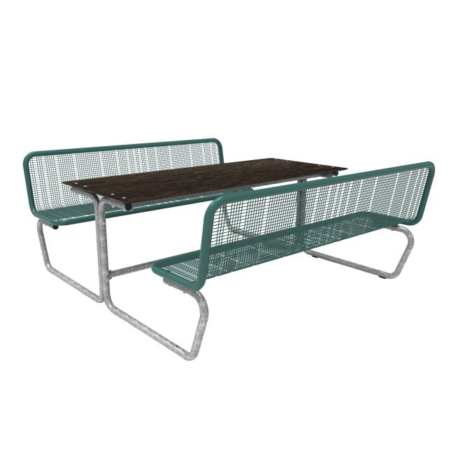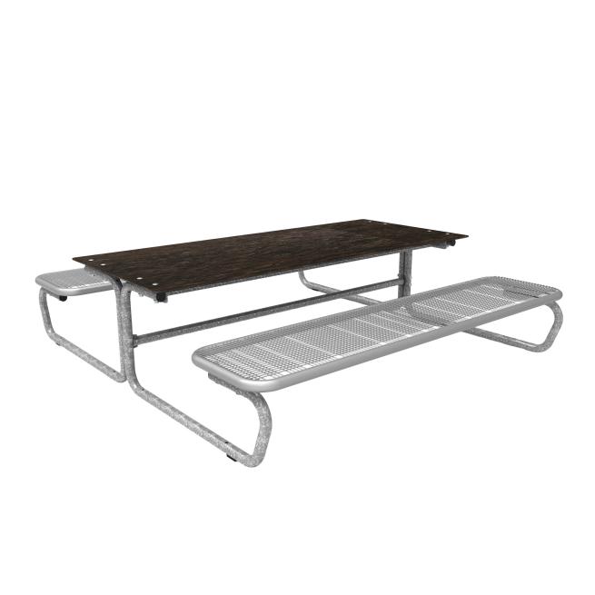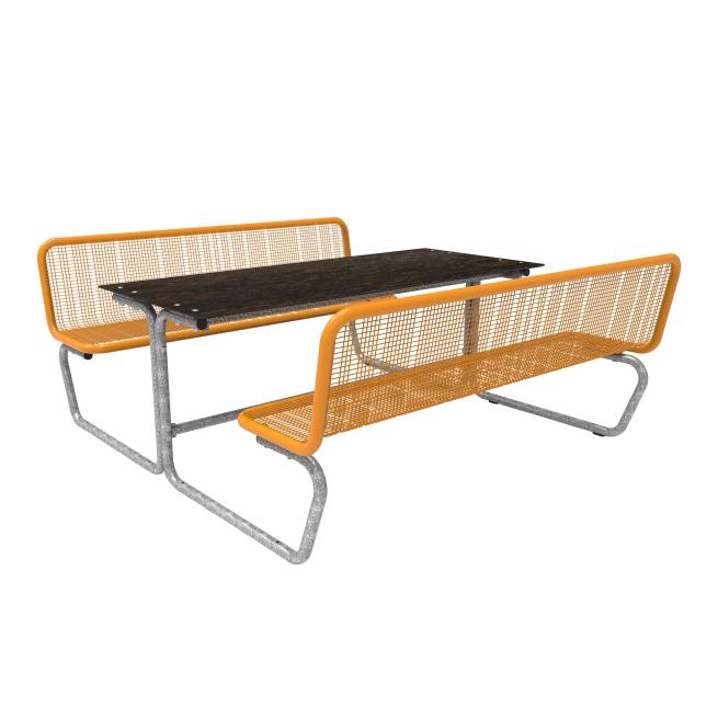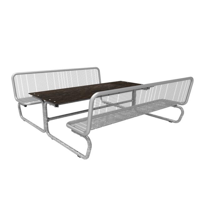 Die Sitzflächen bestehen durchgehend aus Drahtgitter (mit spezifischer Design Rasterung, Drahtstärke 3,3 mm) und Rundrohr (Ø 38 mm). Bodenkontakt: mobil mit Gleitschienen. Eine feste Verbindung mit dem Untergrund ist möglich. Die Tisch-Sitz-Kombinationen sind vorgebohrt (Boden-Befestigungsmaterial ist nicht enthalten).