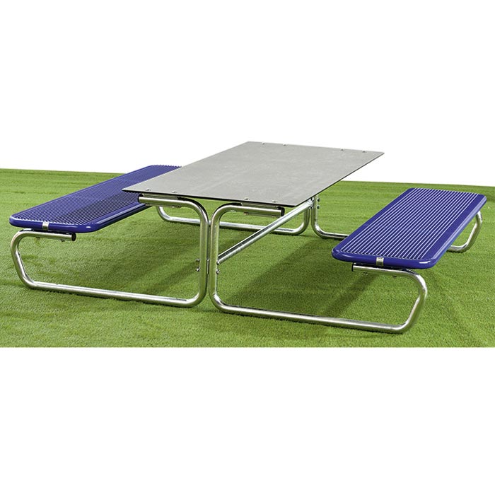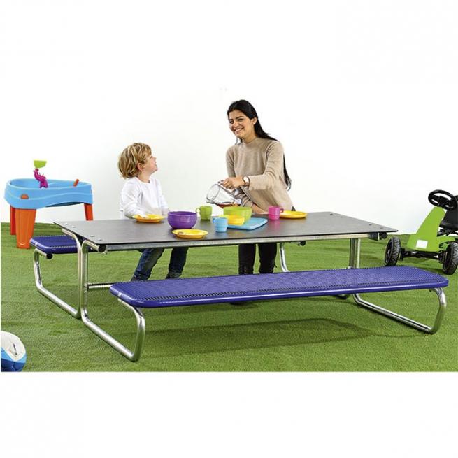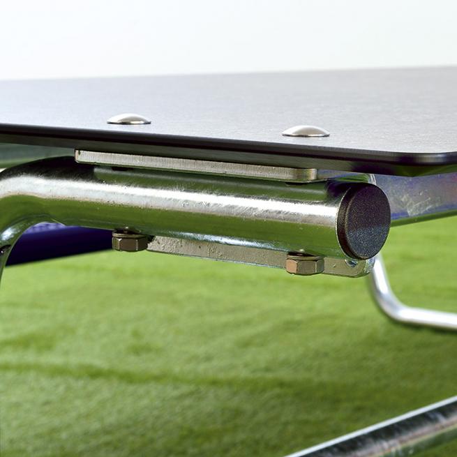 Die Sitzfläche besteht durchgehend aus Drahtgitter (Raster 15 x 15 mm, Drahtstärke 3 mm) und Rundrohr (Ø 38 mm). Bodenkontakt: mobil mit Gleitschienen. Eine feste Verbindung mit dem Untergrund ist jedoch möglich. Die Tisch-Sitz-Kombination ist vorgebohrt (Boden-Befestigungsmaterial ist nicht enthalten).