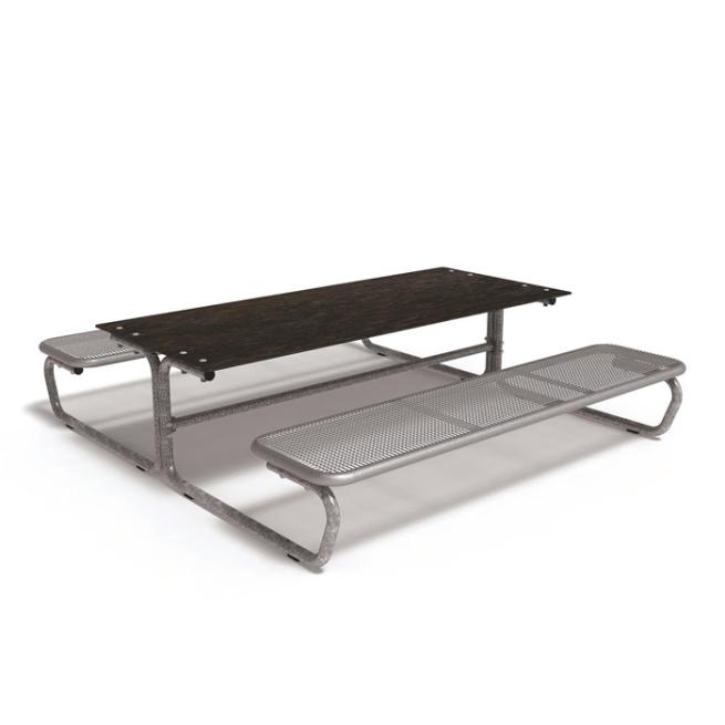 Die Sitzflächen bestehen durchgehend aus Drahtgitter (mit spezifischer Design Rasterung, Drahtstärke 3,3 mm) und Rundrohr (Ø 38 mm). Bodenkontakt: mobil mit Gleitschienen. Eine feste Verbindung mit dem Untergrund ist möglich. Die Tisch-Sitz-Kombinationen sind vorgebohrt (Boden-Befestigungsmaterial ist nicht enthalten).
