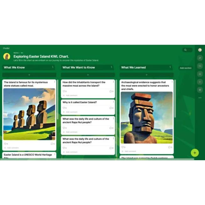 Laden Sie Dateien von Ihren PCs, Laptops, Tablets oder Smartphones hoch und kombinieren Sie alles zu individuellen Pinnwänden, Tafelbildern und Diashows. Nutzen Sie Texte, Fotos, Videos und mehr. Durchsuchen Sie das Internet, um mit wenigen Klicks Web-Inhalte einzubetten. Oder erschaffen Sie mit den integrierten Padlet-Tools auch selbst spannendes Lernmaterial, z. B. Skizzen, interaktive Grafiken, Spiele, Cartoons oder Ton- und Filmaufnahmen (für Audio- und Video-Aufzeichnungen sind zusätzliche Aufnahmegeräte wie Webcams oder Mikrofone erforderlich). Beim Malen und Zeichnen hilft Ihnen bei Bedarf der clevere KI-Assistent.