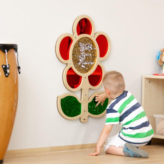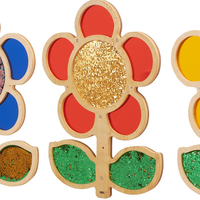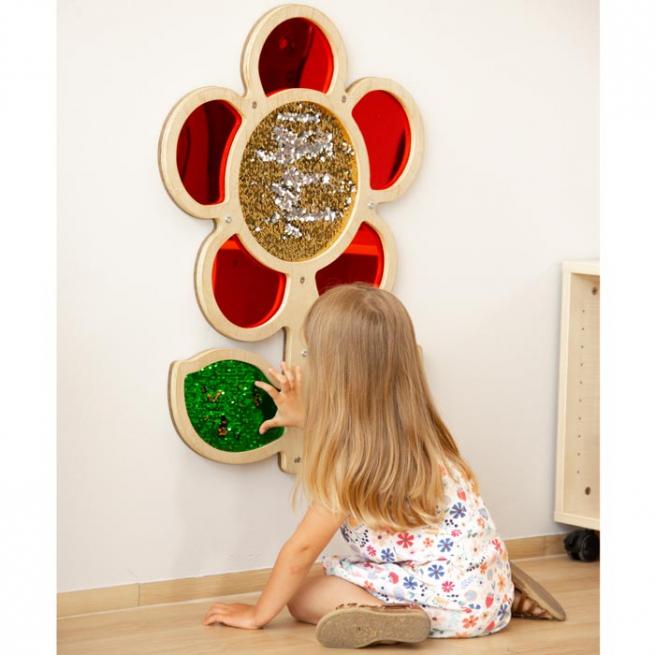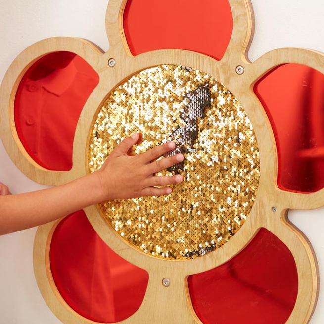 Ihren Tastsinn erkunden Kinder mithilfe des zweifarbigen Paillettenstoffs in den schönen Blumenrahmen. Sobald sie darüberstreichen, drehen sich die Pailletten und eine andere Farbe kommt zum Vorschein. Große Augen inklusive.