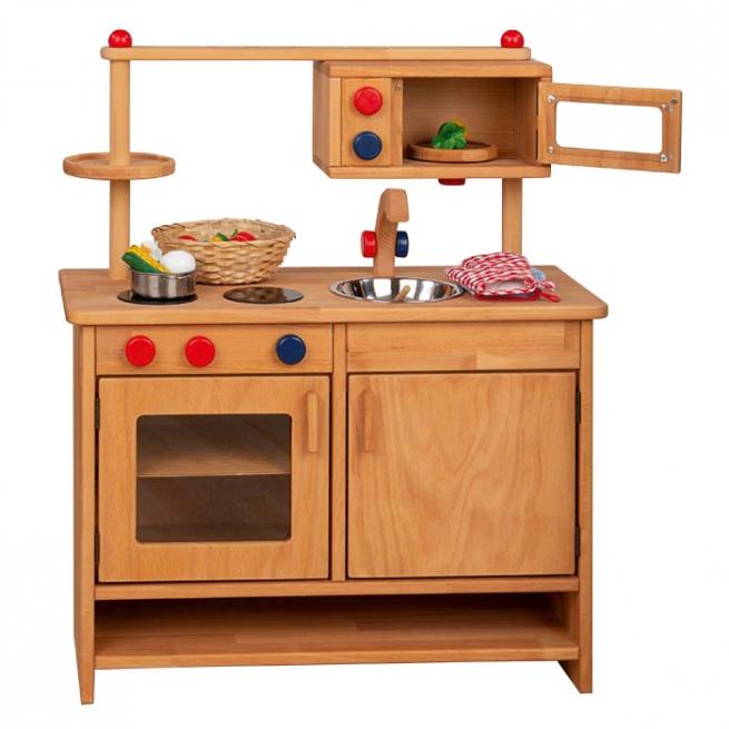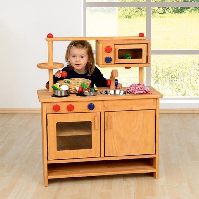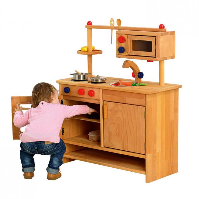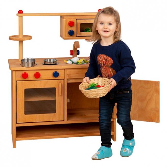 Augenschmaus und leibliches Wohl – die Pantry-Küche in zeitlosem Design verleiht der Puppenecke einen modernen Look. Kleine Chefköche wachsen hier beim Kochen, Backen und Spülen über sich hinaus. Die Knöpfe sind drehbar und die Reling bietet Platz für Kochlöffel sowie Drehteller als Ablage für Gewürze, Obst oder Gemüse.
