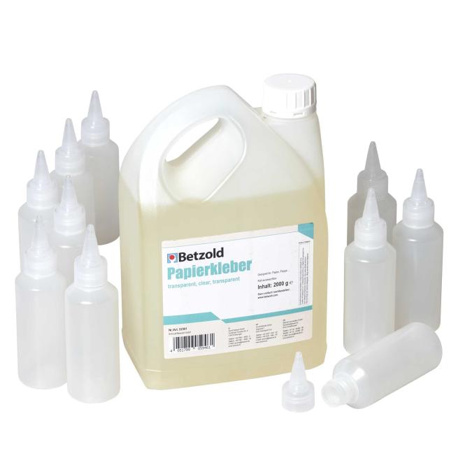 Dieser glasklare Papierkleber hält Bastelarbeiten aus Papier und Pappe dauerhaft zusammen. Füllen Sie unsere Kleber aus dem großen Behälter für Ihre Kinder in praktische Leerflaschen. Er trocknet transparent.