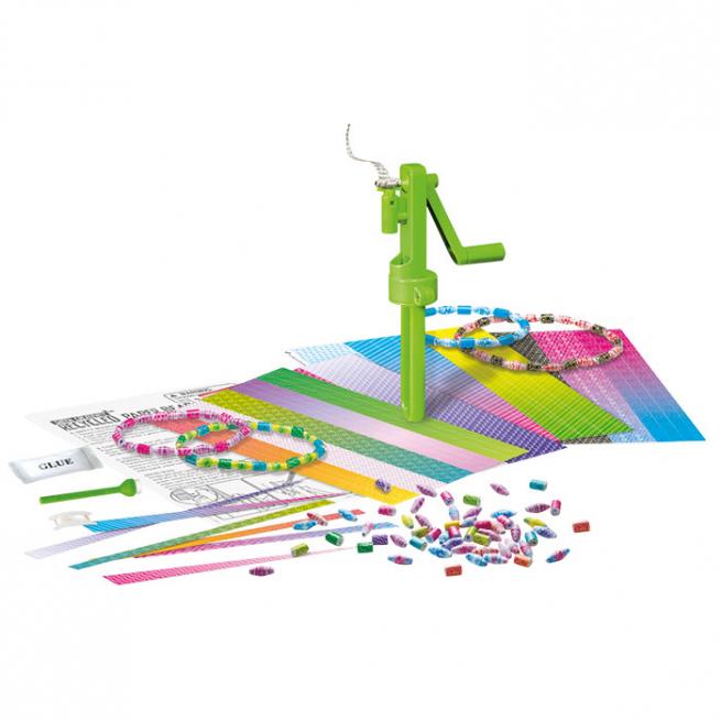 Umweltfreundliche Perlen für schicke Schmuckstücke. Recyceln Sie Geschenk-, Bastelpapier oder Zeitungsreste zu fantastischen Papierperlen. Grüne Drehkurbel auf einer Flasche (nicht enthalten) befestigen, Papierstreifen einlegen, kurbeln und das Ende mit Klebstoff fixieren. Ab 5 Jahren.