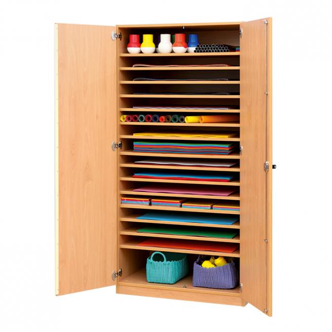 Ideal zum Aufbewahren von Zeichenpapier, Bastelbögen und Plakatkarton. Selbst große Formate bis zu 90 x 55 cm finden hier Platz. Im geschlossenen Schrank liegen Ihre Materialien gut geschützt vor Licht und Staub. Mit 15 höhenverstellbaren Fachböden bietet der Papierschrank besonders viel Ablagefläche.