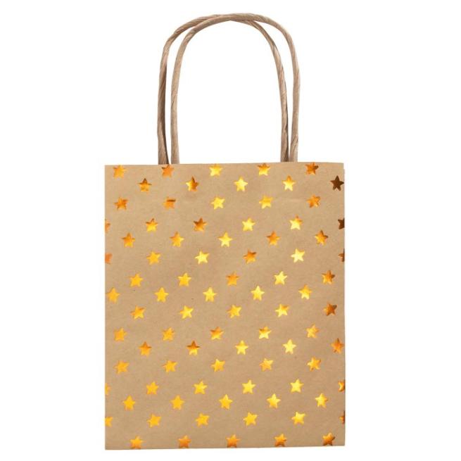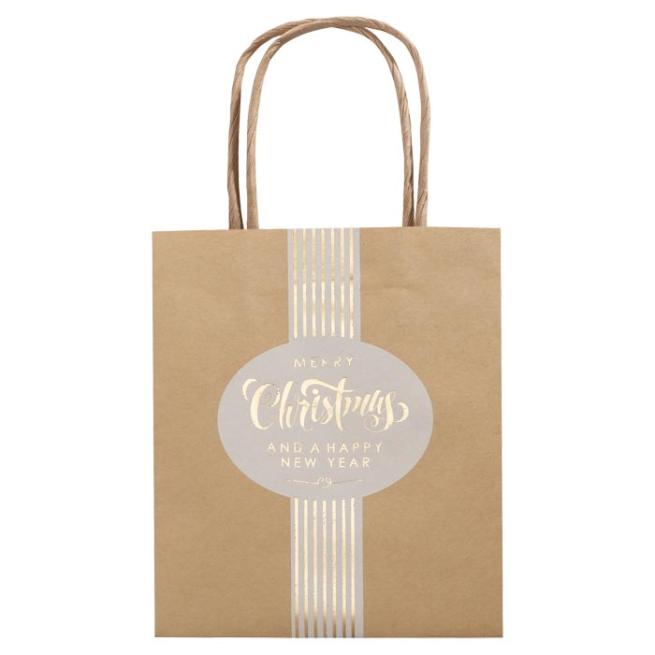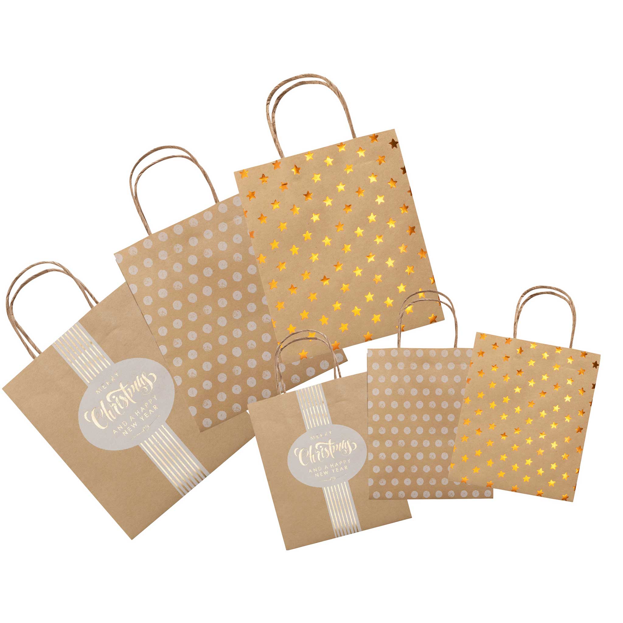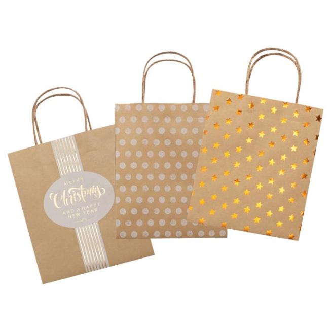 Schicke Verpackungen nicht nur zu Weihnachten. In den jeweils 12 Tüten sind kleine Geschenke oder z. B. selbst gebackene Spezialitäten hübsch verpackt. Die 3 schönen Designs auf dem Kraftpapier sind schöne Hingucker. Tüten mit einfachen Drucken, Folienprägung und gedrehtem Tragegriff.