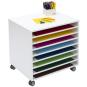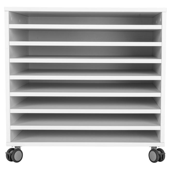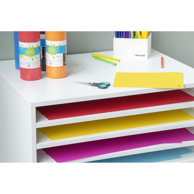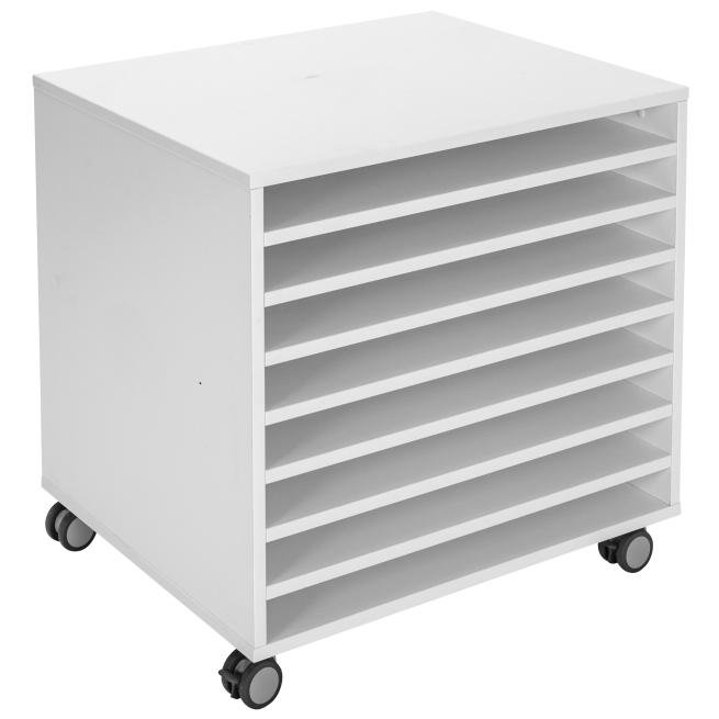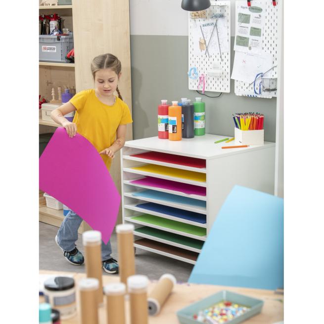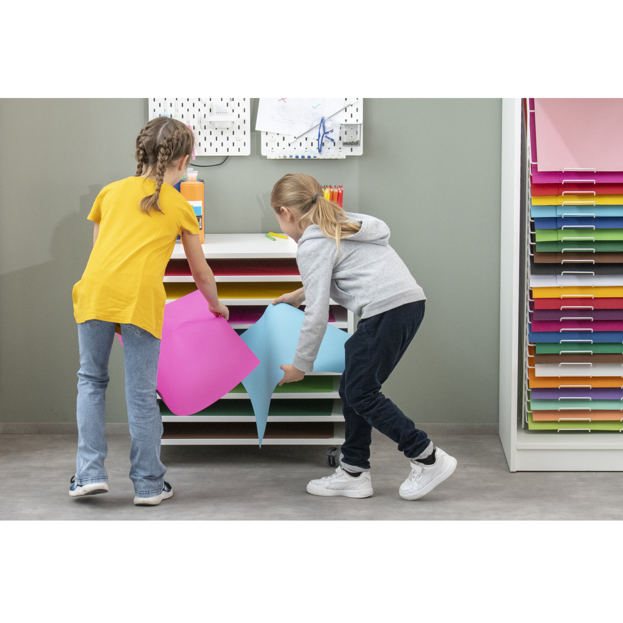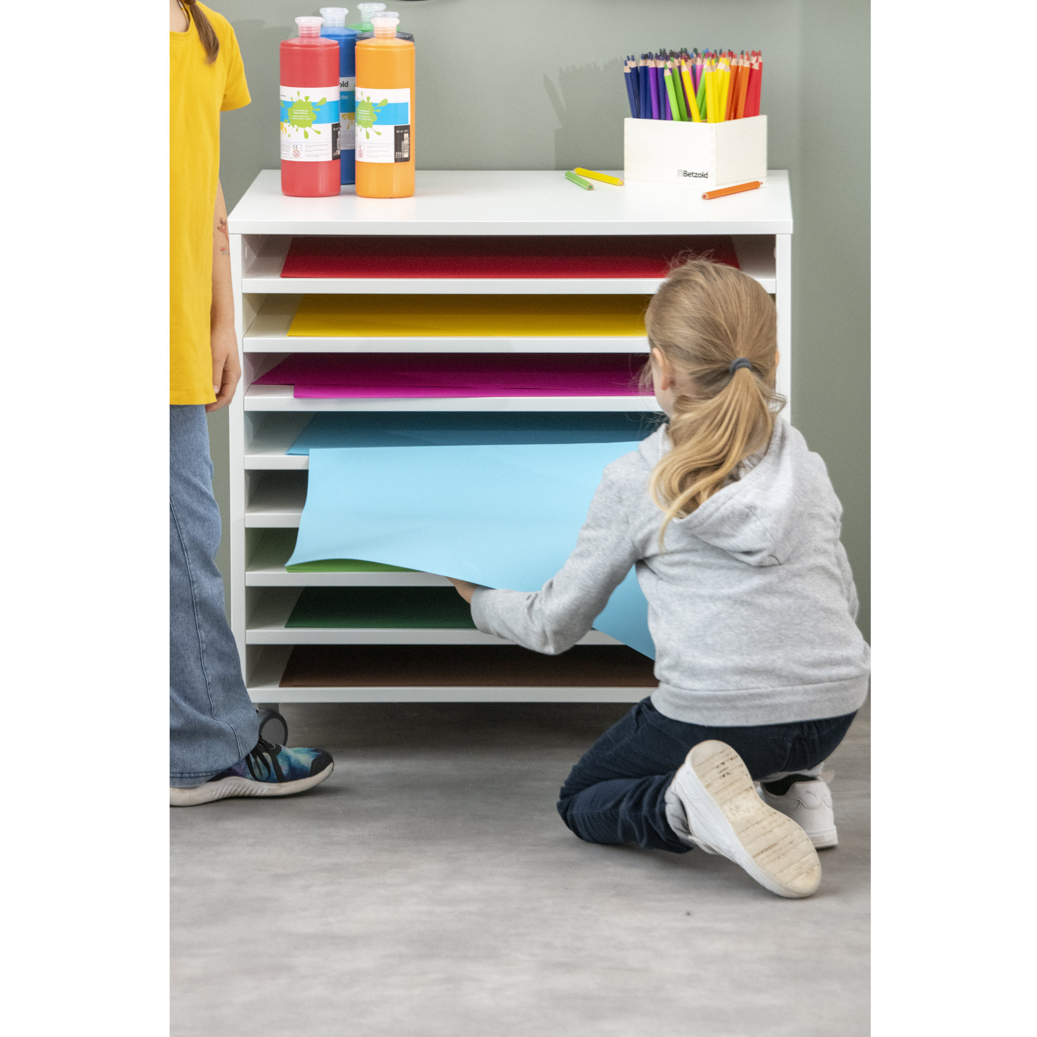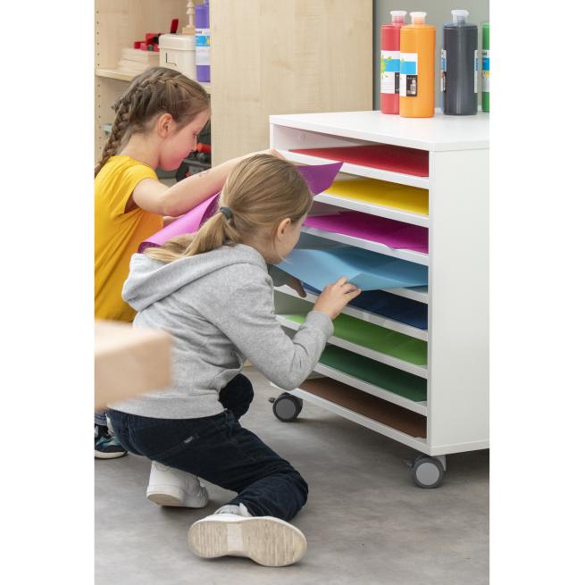Mit 4 praktischen Rollen ausgestattet, lässt sich der Papierwagen flexibel bewegen und sorgt für eine einfache Aufbewahrung. Für sicheren Halt dienen die 2 arretierbaren Rollen. Die 8 Fächer bieten ausreichend Platz für Papierbögen bis zu DIN A2 und ermöglichen eine übersichtliche Aufbewahrung, so können Kinder den benötigten Bogen problemlos entnehmen.