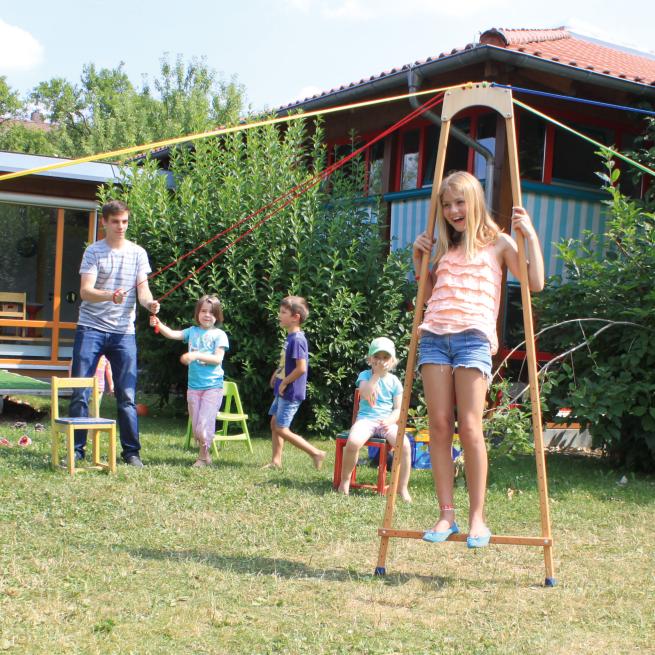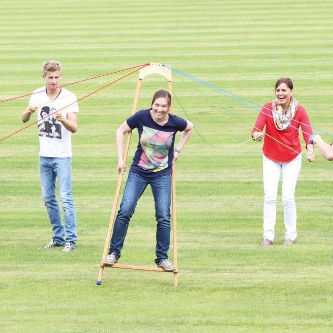 Nur durch Teamarbeit setzen Ihre SuS das laufende A in Bewegung. Während eine Person mittig auf dem Querbalken steht, spannen vier bis acht weitere Kinder gleichzeitig die farbigen Seile nach außen ab. Jetzt ist strategisches, gemeinsames Denken und Handeln gefragt. Wer es noch kniffliger mag, versucht das laufende A ohne Person auf dem Querbalken zu bewegen. Ab 7 Jahren.