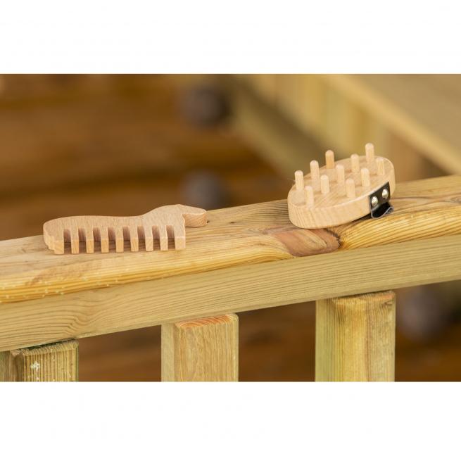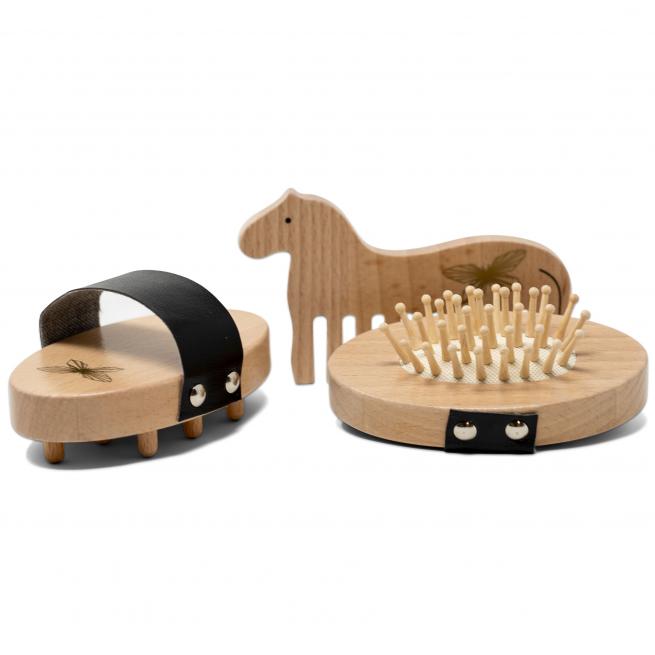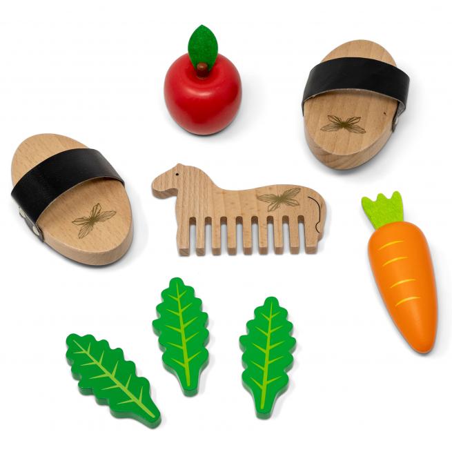 Striegeln, kämmen und ein Snack für zwischendurch – mit dem Set hegen und pflegen Kinder ihre Steckenpferd-Lieblinge bestens. Im Rollenspiel lernen sie so, sich um ihre Pferde zu kümmern und Verantwortung zu übernehmen. Zudem wirkt die Fellpflege durch die sich wiederholenden Bewegungen mit den Bürsten entspannend.