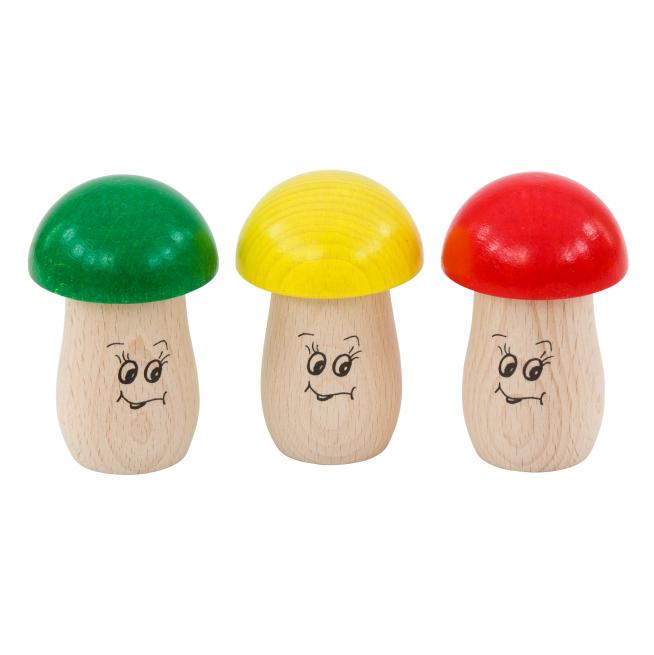 3 Rasseln in Pilzform (je 1 in Rot, Gelb, Grün)